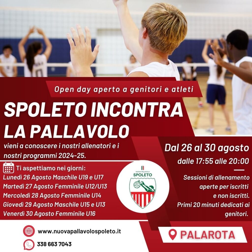 La Nuova Pallavolo Spoleto è lieta di annunciare l’iniziativa “La Pallavolo incontra Spoleto”, una serie di Open Day che si terranno dal 26 al 30 agosto. Questa settimana speciale sarà un’occasione unica per incontrare la nostra società, i genitori e gli atleti, all’inizio di ogni sessione di allenament