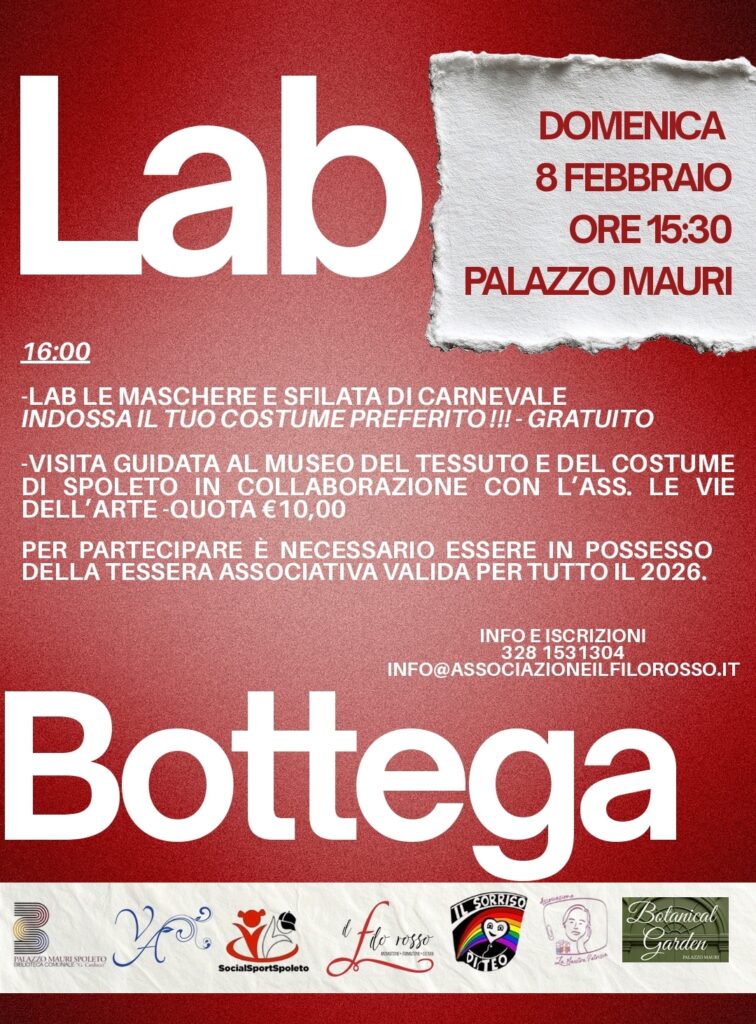 L’Associazione Il Filo Rosso presenta LAB BOTTEGA – Domeniche al Centro, un nuovo progetto culturale e sociale pensato come appuntamento costante ogni seconda domenica del mese, dedicato ad attività artistiche, culturali, ludiche e creative rivolte a bambini, famiglie e cittadini di tutte le età.