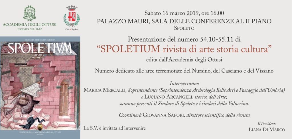 Sabato 16 marzo 2019, alle ore 16 a Palazzo Mauri, sala delle conferenze, si terrà la presentazione del numero 54.10-55.11 di “SPOLETIUM rivista di arte storia cultura” edita dall’Accademia degli Ottusi. Numero dedicato alle aree terremotate del Nursino, del Casciano e del Vissano.