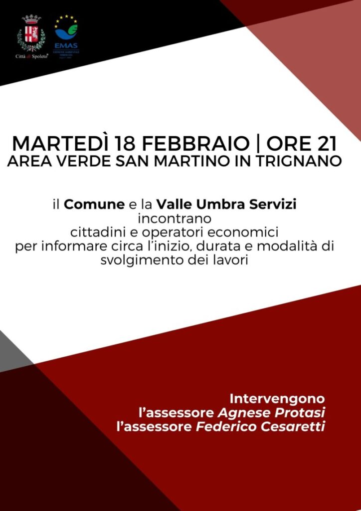 In vista degli interventi che la Valle Umbra Servizi eseguirà a San Martino in Trignano sul sistema fognario di viale Cerquestrette, è stato organizzato dal Comune di Spoleto e da VUS un incontro con cittadini e operatori economici per illustrare le modalità di intervento e il cronoprogramma dei lavori.