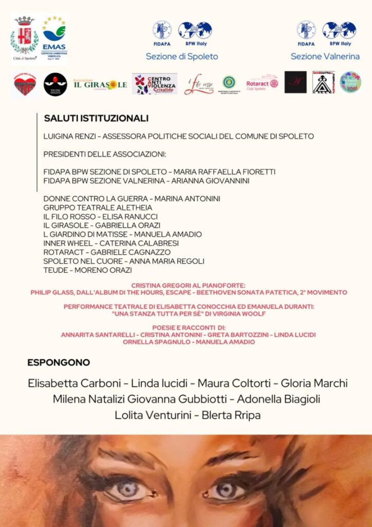 Attraverso le arti della musica, della poesia, della pittura e delle immagini, le associazioni Fidapa Bpw Italy Spoleto e della Valnerina, Spoleto nel cuore, Donne contro la guerra, Gruppo teatrale Aletheia, Il filo rosso, Il girasole, Il giardino di Matisse, Inner Wheel, Rotaract e Teude daranno voce alle artiste del territorio.