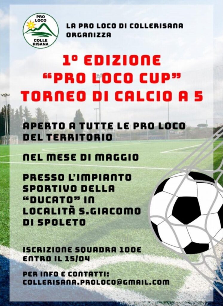 Sono aperte le iscrizioni al Torneo di calcio a 5 promosso e organizzato dalla Proloco di Collerisana aperto a tutte le Proloco del territorio spoletino e dei Comuni vicini. Obiettivo dell’iniziativa, oltre a quello sportivo e ricreativo, è quello di creare occasioni di incontro e convivialità in un territorio vastissimo e anche per questo tendente alla chiusura in piccole comunità.