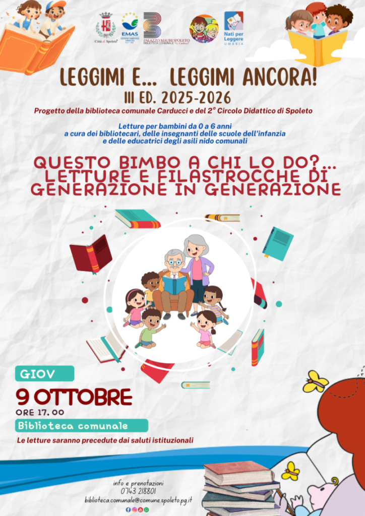 Giunta alla terza edizione, l’iniziativa, organizzata dalla Biblioteca comunale “G. Carducci” e il 2° Circolo Didattico di Spoleto, partner del Patto locale della lettura, si articolerà in 8 incontri a partire dal prossimo 9 ottobre fino a maggio 2026.