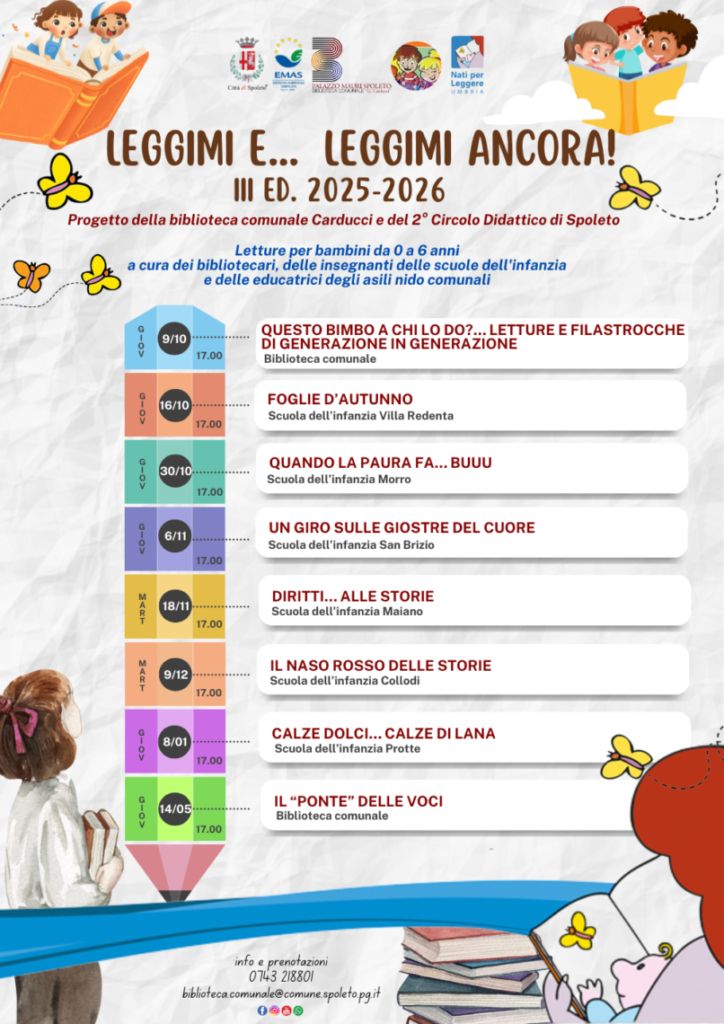 Il progetto “Leggimi e… Leggimi ancora!“, giunto alla terza edizione, organizzato dalla Biblioteca comunale “G. Carducci” e dal 2° Circolo Didattico di Spoleto, partner del Patto locale della lettura, è inserito nel Programma Nati per Leggere.