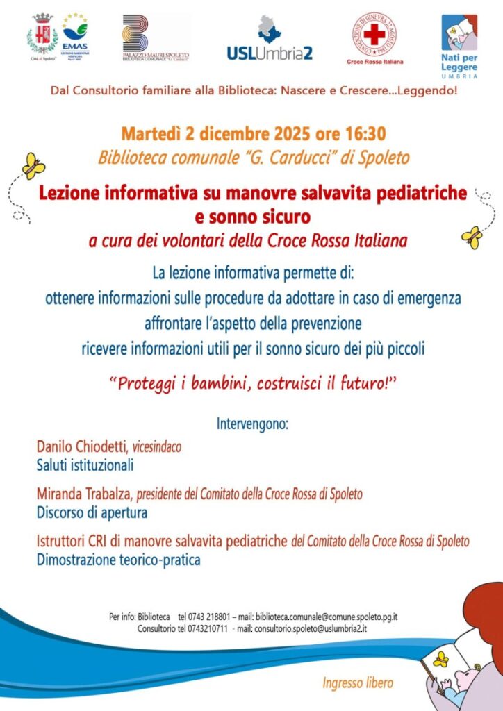 Martedì 2 dicembre 2025, alle ore 16.30, presso la biblioteca comunale “G. Carducci” di Spoleto a Palazzo Mauri si terrà l’incontro dal titolo “Lezione informativa su manovre salvavita pediatriche e sonno sicuro“ a cura dei volontari della Croce Rossa Italiana che parleranno delle procedure da adottare in caso di emergenza, affronteranno l’aspetto della prevenzione e forniranno informazioni utili per il sonno sicuro dei più piccoli.