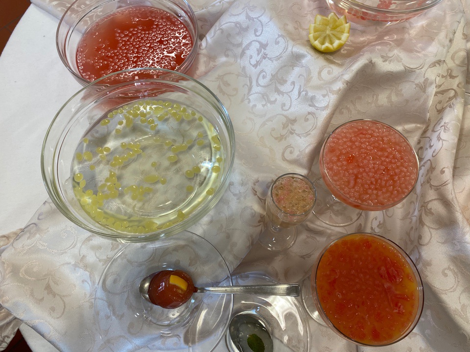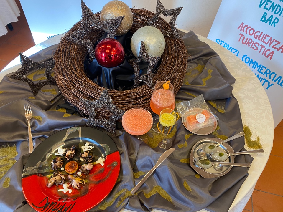 Si è iniziato con dei cocktail molecolari, o liquori portati a ebollizione fin quando non tendono a concentrarsi in una piccola quantità della grandezza di una gelatina. Il risultato è quello di un cocktail meno alcolico ma più concentrato, da mangiare al cucchiaio. Come spiega Damiano Bacciardi del 4 A sala, “la tecnica del cocktail molecolare permette di trasformare l’aperitivo da liquido a solido, rappresentando così i pianeti terrestri. Inoltre, abbiamo pensato di fare questi aperitivi, per gli astronauti che vanno sulla Luna che hanno così la possibilità di degustare un cocktail decisamente italiano, come il “Garibaldi”, realizzato con le arance gialle di Sicilia e il Campari, che sono prodotti made in Italy. Le sfere ottenute con questa tecnica, una volta messe in bocca, sprigionano un liquido che è equivalente all’assumere un cocktail in bevanda”.