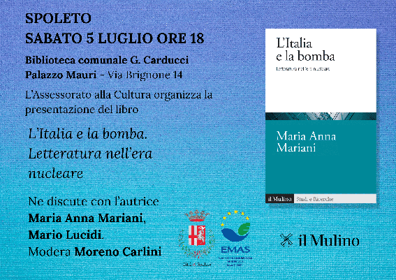 Sarà presentato sabato 5 luglio alle ore 18.00 nelle sale della Biblioteca comunale “G. Carducci” di Spoleto a Palazzo Mauri in via Brignone 14 il libro “L’Italia e la bomba. Letteratura nell’era nucleare” di Maria Anna Mariani.
