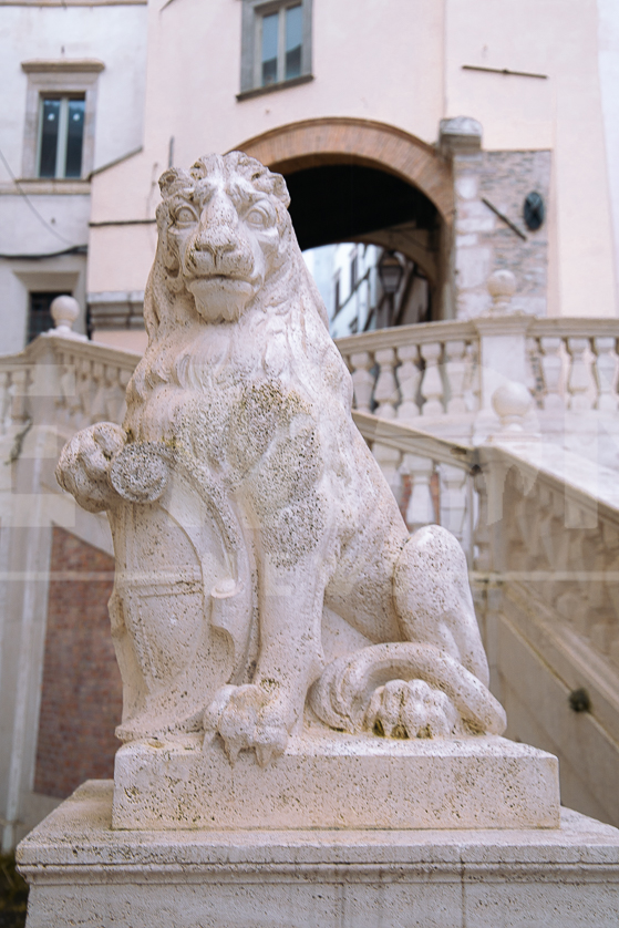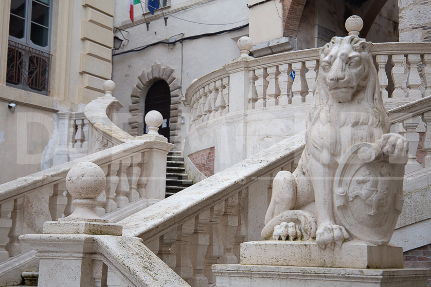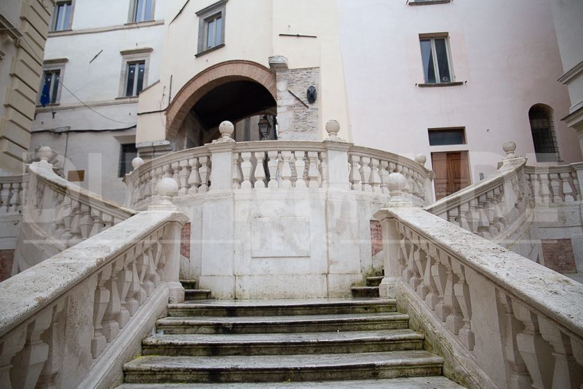 In un primo momento venne approvato il progetto dell’architetto Pompilij, che prevedeva un’unica scala. Successivamente, però, si optò per una soluzione più scenografica: una scalinata a doppio braccio con balaustra, disegnata dall’architetto Ugo Tarchi e realizzata nel 1923.