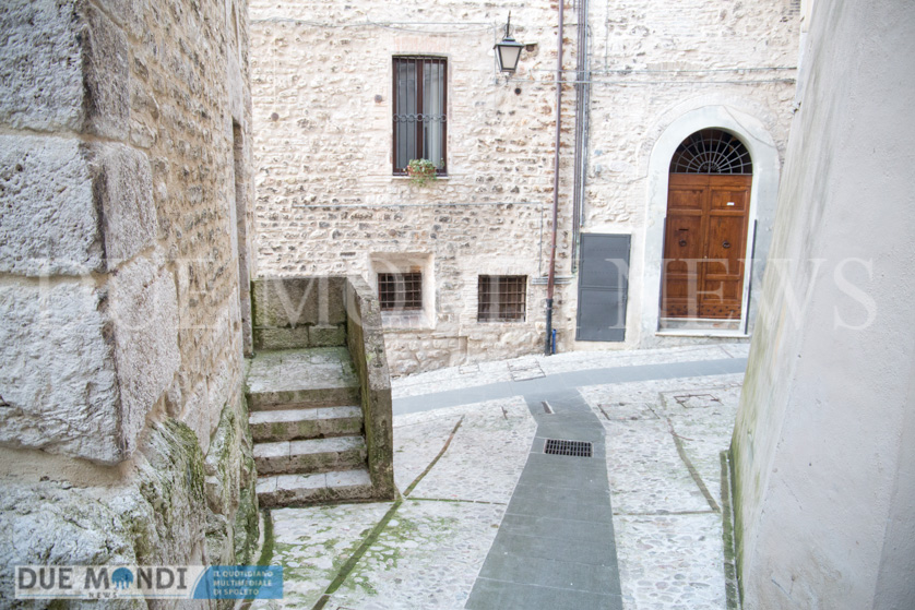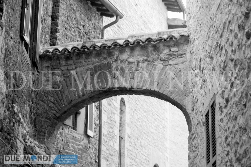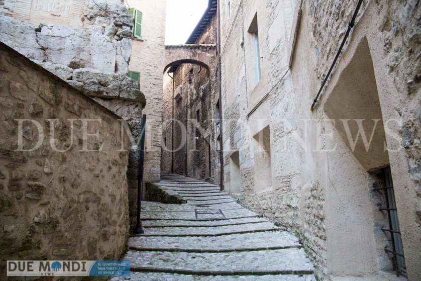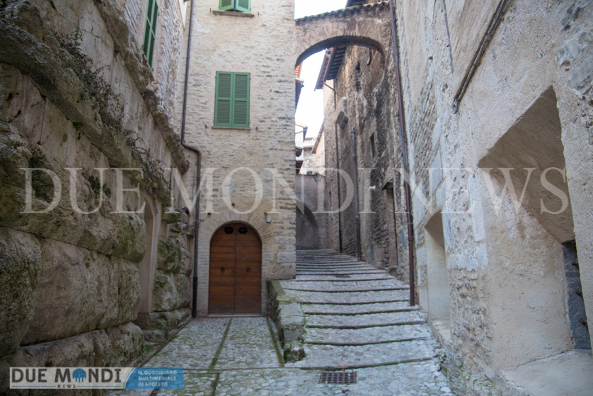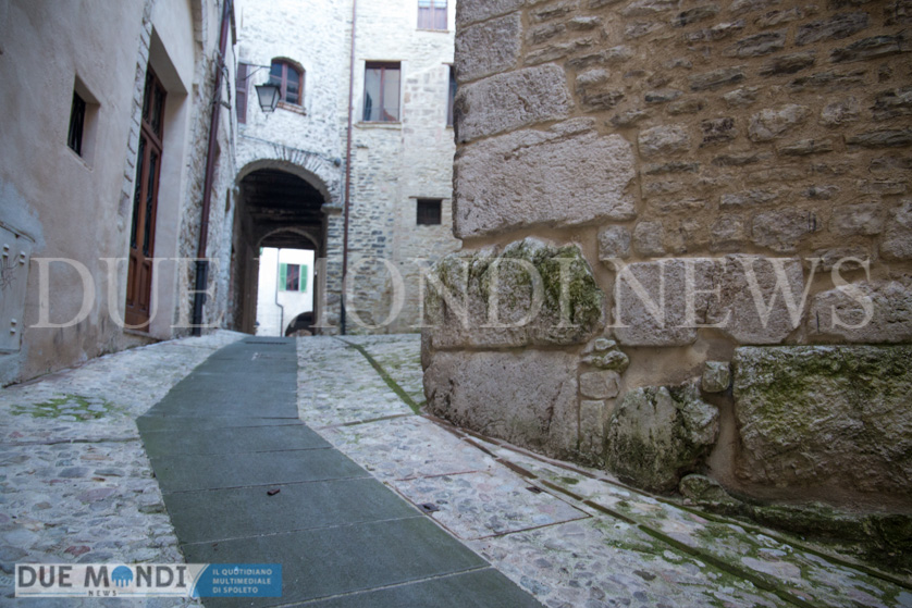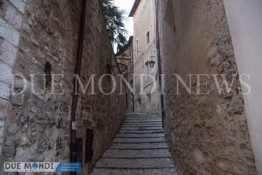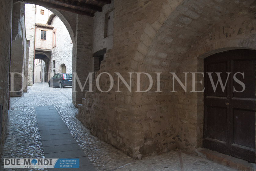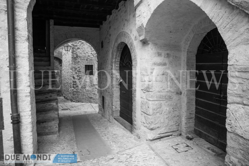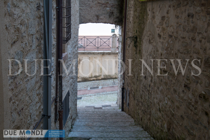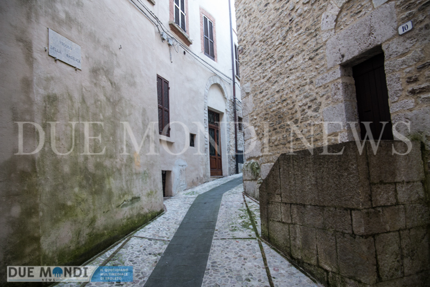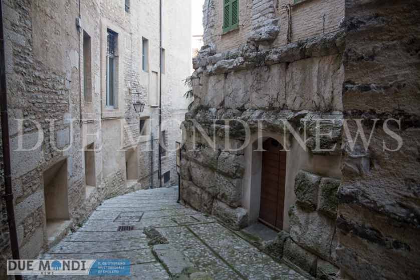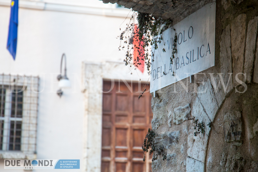 (DMN) Spoleto – dopo Viale Trento e trieste innevato e Piazza Duomo di notte, questa settimana il nostro obiettivo si è fermato nel cuore dell’acropoli, in Vicolo della Basilica. Il vicolo prende il nome da dei resti di una costruzione romana, inglobati attualmente in un palazzo ed identificati nel XIX secolo come ruderi di una ‘Basilica’ e solo successivamente, a seguito di studi approfonditi, attribuiti ad un piccolo tempio. Il vicolo, autentica perla del centro storico, si snoda incastonato tra Via del Municipio e Vicolo di Volusio.