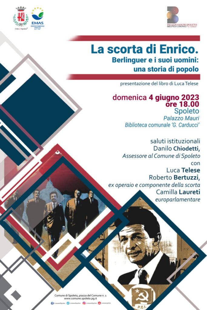 “La scorta di Enrico. Berlinguer e i suoi uomini: una storia di popolo”. Questo il titolo del libro di Luca Telese, che l’autore presenterà a Spoleto domenica 4 giugno alle ore 18.00.