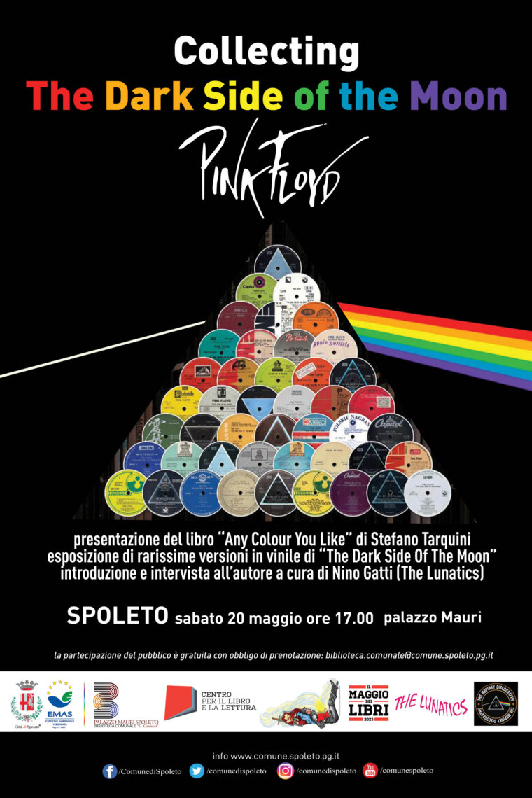 A palazzo Mauri sarà esposta una selezione di rarissime edizioni in vinile di “The Dark Side of the Moon” provenienti da tutto il mondo. L’esposizione viene allestita in occasione dell’incontro per celebrare l’uscita dell’ultimo libro di Stefano Tarquini “Any Colour You Like – The Dark Side Of The Moon On Vinyl”, un volume in edizione limitata, di oltre 1000 immagini, che illustra le 700 varianti conosciute del capolavoro dei Pink Floyd su vinile: dalla prima edizione britannica del marzo 1973 con etichette a prisma blu pieno, alle stampe più oscure del Nicaragua e del Mozambico. Stefano Tarquini, alias MrPinky, è uno dei maggiori collezionisti al mondo di vinili floydiani.