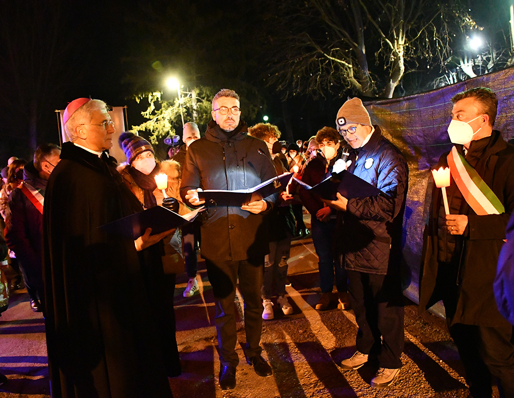 Le parole dell’Arcivescovo all’avvio della fiaccolata. «Siamo qui questa sera per dire che la pace è il bene più prezioso che non si può perdere per nessuna ragione. Condanniamo con fermezza l’aggressione al popolo ucraino. Noi non vogliamo essere contro, vogliamo esser per, a favore dell’intesa tra i popoli, del rispetto della sovranità di ciascuno, della libertà e dell’autodeterminazione. Vogliamo dire no ad ogni forma di sopraffazione, di mancato rispetto della libertà, ad ogni forma di violenza, sapendo che la guerra genera solo guerra, che non risolve i problemi ma li moltiplica e li rende ancora più gravi. Abbiamo voluto venire qui nella terra di S. Benedetto patrono d’Europa, uomo che ha saputo mettere insieme i popoli europei pur diversi, dando loro una radice comune, aiutandoli a vivere l’uno con l’altro e non l’uno contro l’altro: ci rivolgiamo a lui in questo momento così tragico per il popolo dell’Ucraina e del nostro Continente. Chi avrebbe detto che mentre si stava uscendo dalla pandemia si sarebbe dovuto affrontare un momento così tragico che disorienta e fa dubitare della coscienza e dell’intelligenza degli uomini. Fa impressione vedere mamme e bambini che partono con quel poco che hanno addosso e lasciano i mariti a combattere e con una lacerante preoccupazione: chissà se ci rivedremo. Di fronte a tutto a questo gli uomini e le donne di buona volontà non possono non dire: no e mai più».