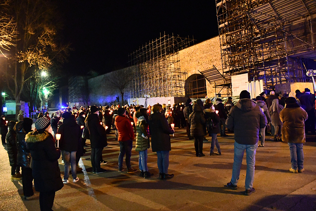 Le meditazioni lungo il cammino. Durante la fiaccolata ha regnato il silenzio. A Porta Romana c’è stata la prima tappa. Sono stati letti: una parte del discorso di Paolo VI all’Assembla Generale delle Nazioni Uniti del 1965 in cui diceva che «se volete essere fratelli, lasciate cadere le armi dalle vostre mani»; alcuni passi tratti dagli scritti di Lord Robert Baden-Powell fondatore degli Scout in cui, tra l’altro, affermava che «con la buona volontà e la cooperazione, le nazioni simpatizzeranno tra loro, e i politicanti scopriranno che non è più possibile trascinare in guerra i popoli che sono amichevolmente disposti l’uno verso l’altro». A metà Corso Sertorio c’è stata la seconda tappa in cui è stato letto il passo del libro della Genesi (1, 26-31) sulla creazione dell’uomo e della donna e alcune parole tratte da un Anonimo brasiliano dove emerge il pianto di Dio per le cattiverie dell’uomo. Giunti in Piazza S. Benedetto è stato letto parte di un discorso di papa Francesco del 2013 in cui diceva «vogliamo un mondo di pace, vogliamo essere uomini e donne di pace, vogliamo che in questa nostra società, dilaniata da divisioni e da conflitti, scoppi la pace»; infine, sono state condivise alcune parole di Etty Hillesum scrittrice olandese vittima dell’olocausto: «una pace futura potrà essere veramente tale solo se prima sarà stata trovata da ognuno in sé stesso, se ogni uomo si sarà liberato dall’odio contro il prossimo, di qualunque razza o popolo, se avrà superato quest’ odio e l’avrà trasformato in qualcosa di diverso, forse – alla lunga – in amore…».