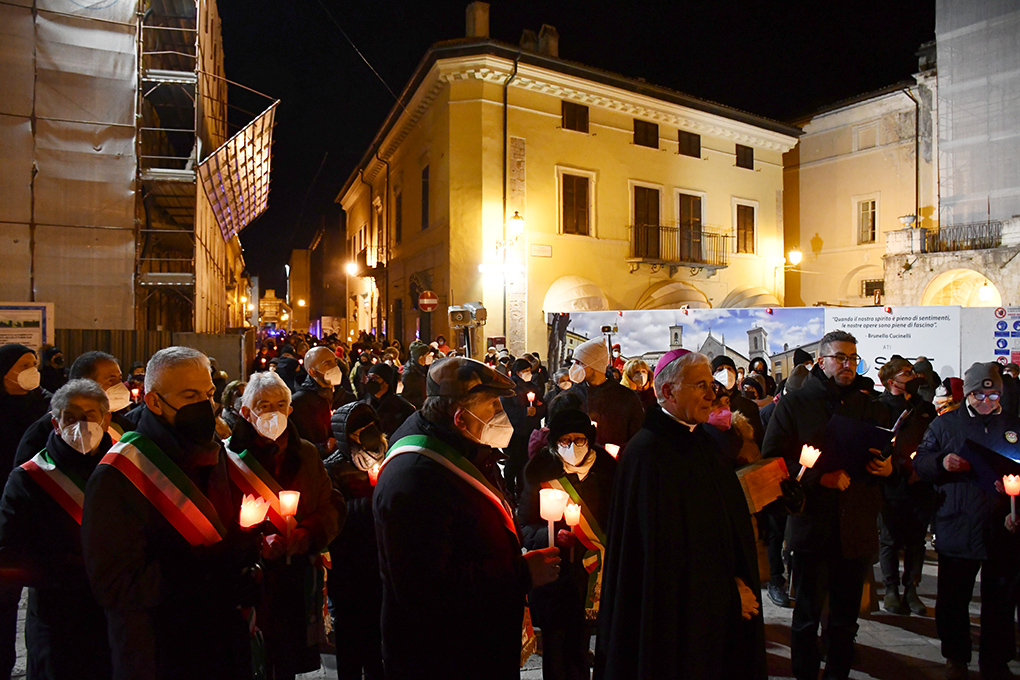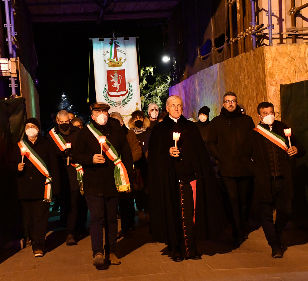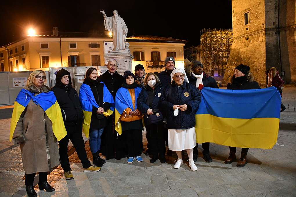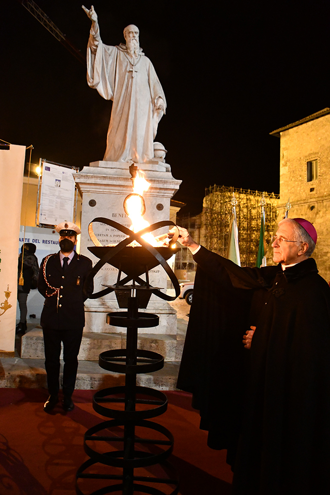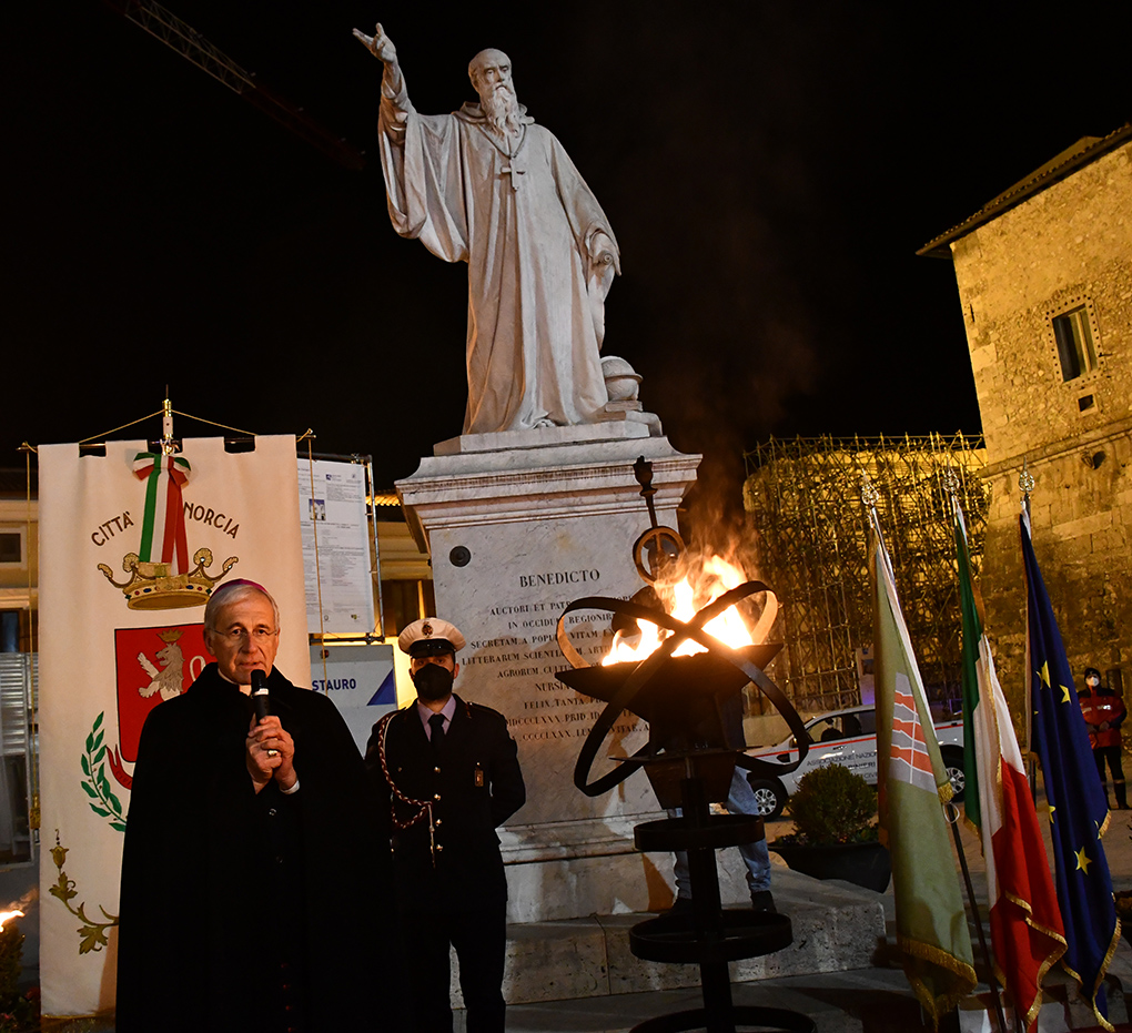 Fiaccolata a Norcia: l’Arcivescovo Boccardo ha acceso un tripode dinanzi la statua del Santo patrono d’Europa: «Ci rivolgiamo a lui in questo momento così tragico per il popolo dell’Ucraina e del nostro Continente. Ispirandoci a S. Benedetto vorremmo essere per quanti busseranno alle nostre porte fratelli e sorelle in umanità»