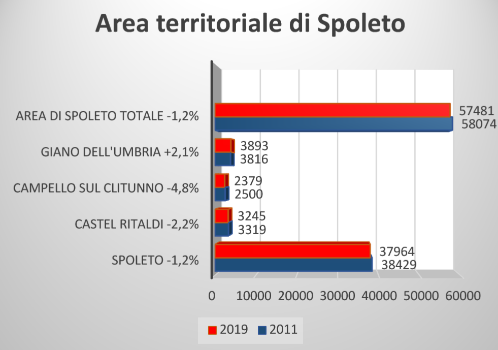 Molto diversificata è però la situazione delle varie realtà. Nei 4 comuni dell’area territoriale di Spoleto, si registra una leggera riduzione degli abitanti, che passano dai 58.074 del 2011 agli attuali 57.481(-1,2%). Nel dettaglio la situazione è questa: Spoleto passa dai 38.429 abitanti del 2011 ai 37.964 del 2019(-1,2%). Castel Ritaldi dai 3.319 del 2011 agli attuali 3.245(-2,2%), Campello dai 2.500 del 2011 a 2.379 nel 2019(-4,8%). Ha una tendenza invece in aumento Giano dell’Umbria che passa dai 3.816 abitanti del 2011 agli attuali 3.893(+2,1%).