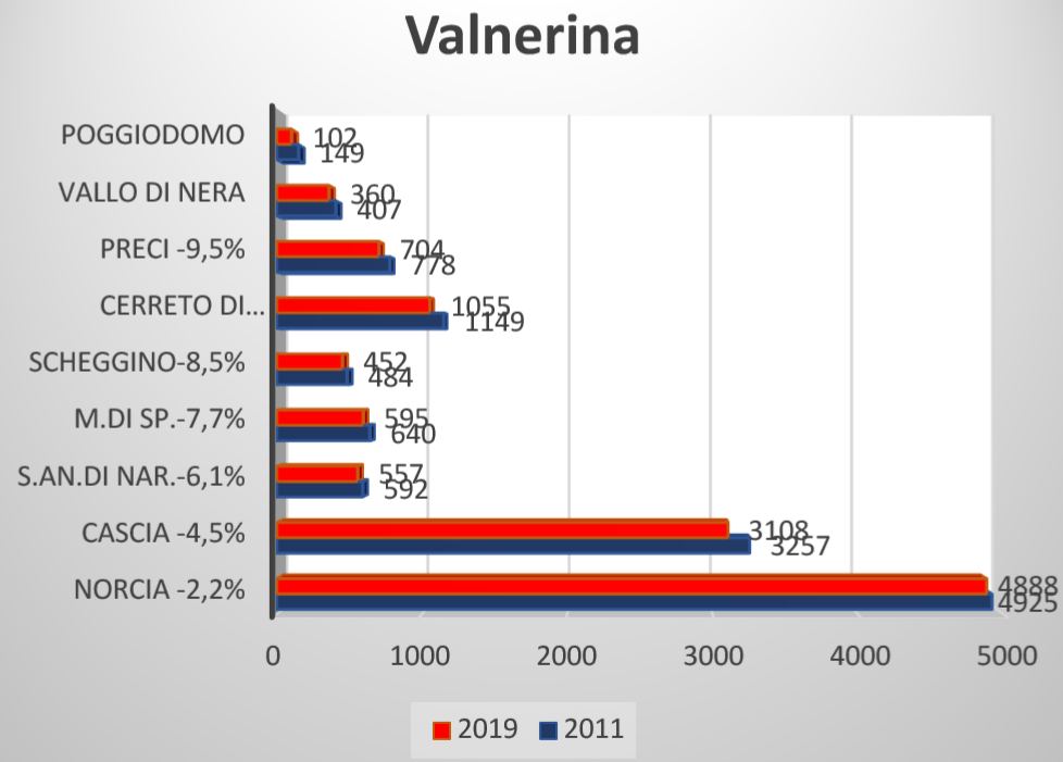 Il comune di Norcia passa dai 4.925 abitanti del 2011 agli attuali 4.888(-2,2%),Cascia dai 3.257 del 2011 ai 3.108 di oggi(-4,5%),Sant’Anatolia di Narco da 592 abitanti del 2011 ai 557 di oggi(-6,1%),Monteleone di Spoleto da 640 abitanti del 2011 a 595 del 2019(-7,7%),Scheggino passa dai 484 del 2011 ai 452 di oggi(-8,5%),Cerreto di Spoleto da 1.149 abitanti del 2011 a 1.055 abitanti nel 2019,Preci da 778 nel 2011 a 704 oggi(-9,5%),Vallo di Nera da 407 abitanti nel 2011 a 360 nel 2019 e infine Poggiodomo che passa da 146 abitanti nel 2011 a 102 nel 2019.