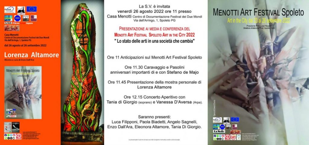 Proprio nella giornata di venerdì alle ore 11 si presenta la Mostra personale di Lorenza Altamore a cura del prof Enzo Dall’Ara ( in foto con Lorenza Altamore e Patrizia Dalla Valle)  che sarà aperta a Casa Menotti fino al 26 settembre. Per l’occasione partecipano alla giornata evento Luca Filipponi, presidente della kermesse, Paola Biadetti, direttore della comunicazione e dello Spoleto meeting Art, Tania di Giorgio, direttore musicale del menotti art festival Spoleto,la stilista Eleonora Altamore, il critico d’arte Sandro Costanzi, l’attore e regista Stefano de Majo che annuncia il suo ultimo lavore di sperimentazione teatrale Pasolini-Caravaggio, oltre a dall’Ara ed Altamore Lorenza come protagonisti.