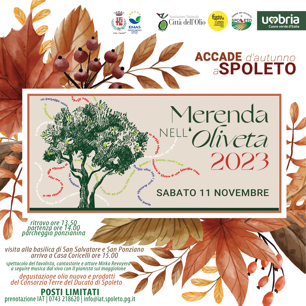 L’iniziativa, organizzata dal Comune di Spoleto e promossa dall’Associazione Nazionale Città dell’Olio di cui l’Ente è socio, è inserita nel programma di ‘Accade d’Autunno a Spoleto’ e ‘Frantoi Aperti’ e prevede una passeggiata nel paesaggio olivicolo spoletino per far conoscere le tipicità, sia paesaggistiche che enogastronomiche, del nostro territorio.
