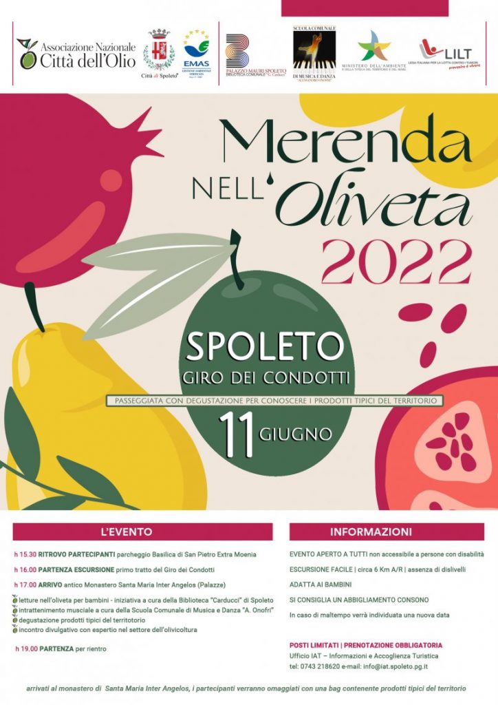 “Merenda nell’Oliveta” è il titolo dell’iniziativa organizzata dal Comune di Spoleto in programma sabato 11 giugno. L’appuntamento, promosso dall’Associazione Nazionale Città dell’Olio di cui l’Ente è socio e che che annualmente organizza eventi volti alla tutela e alla valorizzazione del paesaggio e del patrimonio olivicolo, prevede una passeggiata nel paesaggio olivicolo come occasione per entrare in contatto con la natura attraverso la magia e la bellezza dei luoghi storici degli olivi, alla scoperta delle tipicità, sia paesaggistiche che enogastronomiche, del nostro territorio.