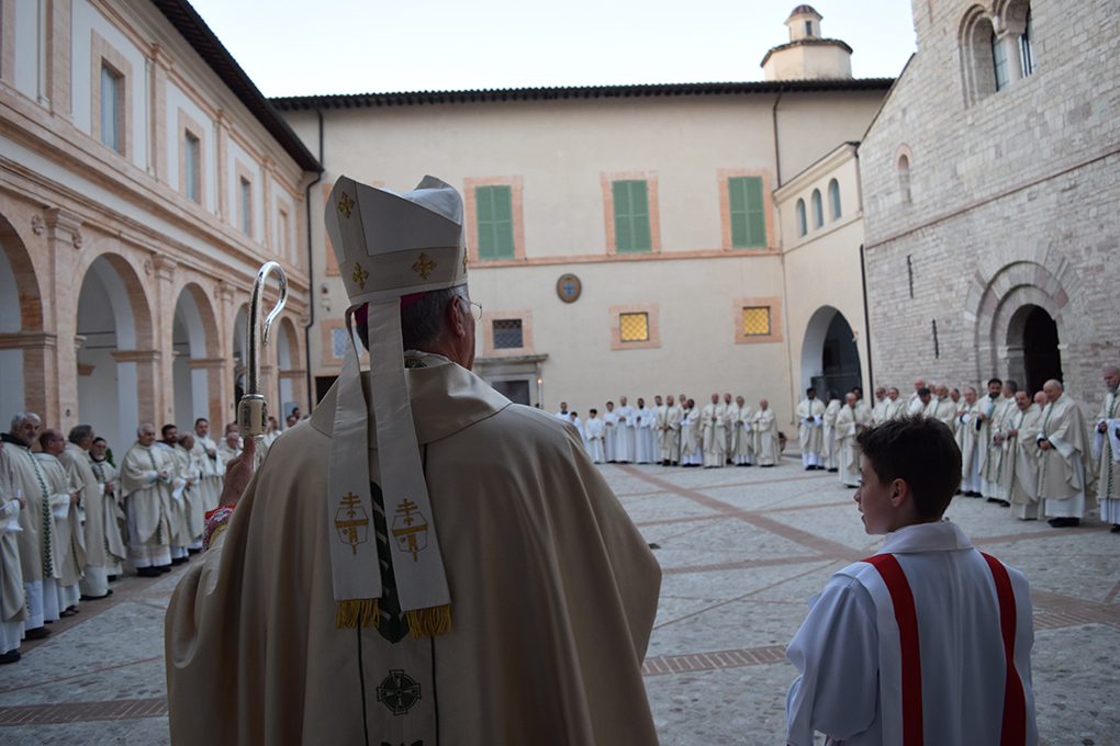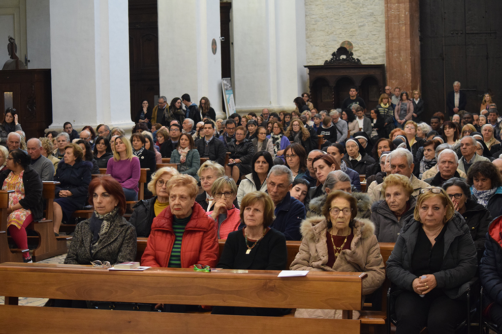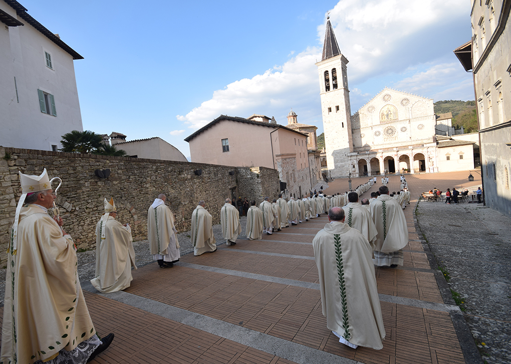 Anniversari di ordinazione dei presbiteri. All’inizio dell’omelia l’Arcivescovo ha ricordato i nomi di quei presbiteri che in questo 2019 celebrano un anniversario significativo di sacerdozio: don Natale Rossi (parroco emerito di S. Giorgio di Cascia, presbitero più anziano della Diocesi) 70 anni di Messa; padre Giorgio Giamberardini (dei Passionisti della Madonna della Stella in Montefalco) 65 anni; mons. Luigi Galli (canonico penitenziere della Cattedrale), don Guido Mondi (parroco emerito di Turrita di Montefalco), padre Luigi Sperduti (degli Agostiniani Scalzi di Santa Rita in Spoleto) e padre Alipio Vincenti (degli Agostiniani di Cascia) 60 anni; mons. Giovanni Scanavino (vescovo emerito di Orvieto-Todi, residente nel convento degli Agostiniani di Cascia) e don Mario Giacobbi (canonico della Cattedrale) 55 anni di sacerdozio; mons. Luigi Piccioli, (vicario generale), mons. Vittorio Pignoloni (cappellano militare emerito), padre Oronzo Saponaro (dei Frati Minori di Monteluco di Spoleto) e don Mario Giacometti (dei Missionari del Preziosissimo Sangue di Giano dell’Umbria) 50 anni; padre Giuseppe Thekkummattom (parroco di Montefranco) e padre Raffaello Tonello (dei Frati Minori della Custodia di Terra Santa) 25 anni di Messa. Si è pregato anche per i confratelli che nell’ultimo anno sono tornati nella Casa del Padre: padre Remo Piccolomini (degli Agostiniani di Cascia) e il diacono permanente Fernando Masetti.