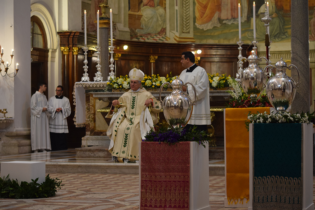 Consacrazione degli Oli Santi. Nella Messa Crismale il Vescovo ha consacrato gli Oli Santi e i presbiteri hanno rinnovato le promesse fatte il giorno dell’ordinazione. L’Olio degl’infermi cancella nel cristiano sofferente i resti del peccato, lo fortifica nell’estremo combattimento e, per la virtù soprannaturale che possiede, talvolta gli restituisce anche la sanità corporale. Il Crisma, olio più balsamo, conferisce robustezza: unto di quest’olio, il fedele diviene visibilmente membro dell’Uomo-Dio, il cui nome Cristo significa l’unzione ricevuta come Re e Pontefice. È usato nel Battesimo, nella Cresima, nella consacrazione dei Vescovi e dei presbiteri, nella dedicazione delle chiese. Questo sacro olio a Spoleto verrà usato per la prima volta il 27 aprile prossimo quando alle ore 18.00 in Cattedrale l’Arcivescovo ordinerà sacerdote il giovane spoletino Pier Luigi Morlino. Con l’Olio dei Catecumeni, infine, viene unto il petto di chi si prepara a ricevere il Battesimo. Tale Unzione significa la forza di Dio per vincere il combattimento contro il peccato.