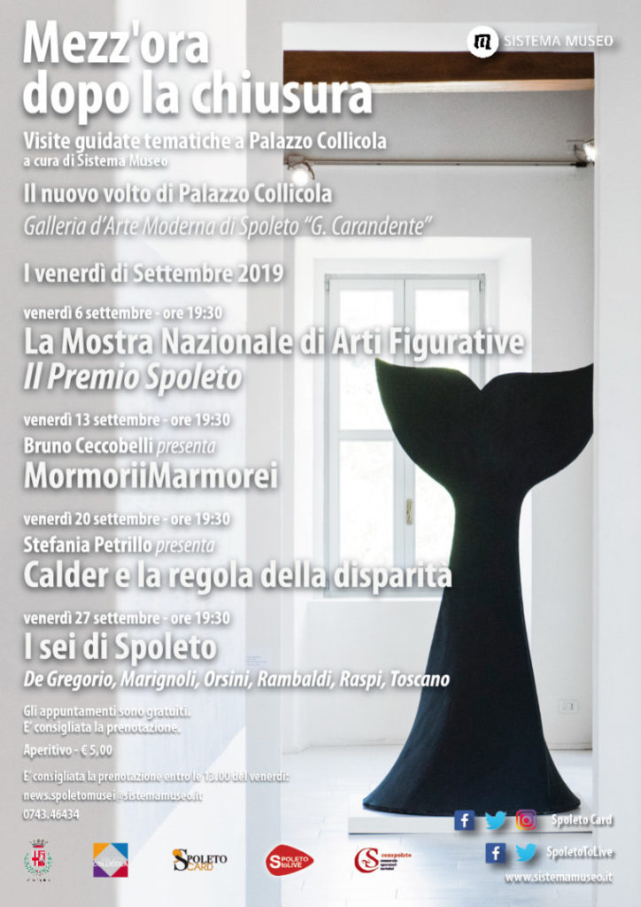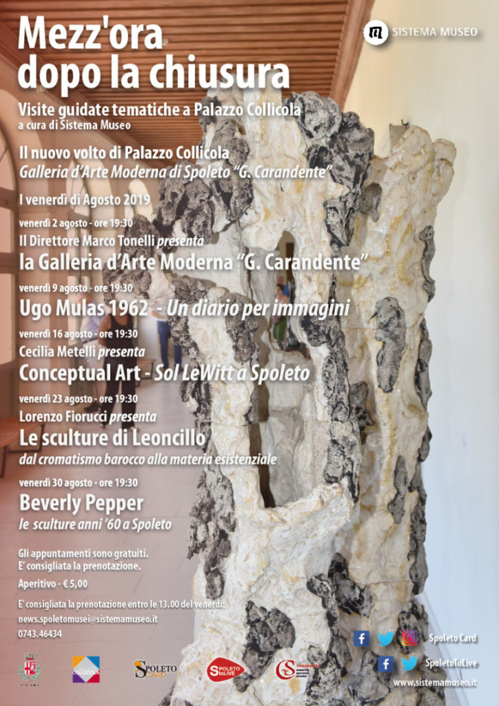 Mezz’ora dopo la chiusura, l’evento a cura di Sistema Museo, presenta un programma dedicato interamente al nuovo volto di Palazzo Collicola. Il programma dei venerdì dedicati a Palazzo Collicola e alla Galleria d’Arte Moderna di Spoleto “G. Carandente” si sviluppa nei mesi di agosto e settembre alle ore 19.30, con temi che illustrano al pubblico, cittadini e turisti, il nuovo allestimento della Galleria d’Arte Moderna a cura del Direttore Marco Tonelli, inaugurato lo scorso 29 giugno, del quale si potrà scoprire il nuovo concept per sale tematiche e le nuove acquisizioni.