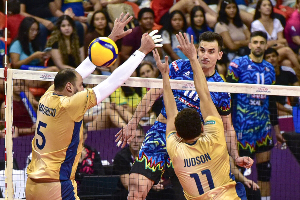 In apertura del match Plotnytskyi spinge subito forte al servizio, si procede punto a punto nei primi scambi, con i brasiliani che trovano il primo break con gli attacchi di Newton e Adriano. Giannelli arma Loser che in primo tempo annienta il tentativo di allungo dei verdeoro e Plotnytskyi in maniout rimette i conti in equilibrio. Arriva uno scambio lunghissimo e spettacolare chiuso dal muro di Matheus sulla pipe dello schiacciatore ucraino, ma nella fase centrale è Perugia a trovare l’allungo con la diagonale stretta di Semeniuk, che poi trova anche il maniout, e il servizio vincente di Wassim Ben Tara (13-10). Il muro granitico di Simone Giannelli su Adriano vale il +4, Plotnytskyi consolida con un block-out e Solè mura Newton e porta i suoi avanti 16-11. L’opposto bianconero piazza una diagonale violentissima e Plotnytskyi un monter block sull’attacco di Thiago. Ancora una diagonale di Ben Tara e Perugia domina il gioco, volando verso il finale di set (22-13). È l’opposto tunisino ad agganciare il set point, chiude Loser in maniout 25-15.