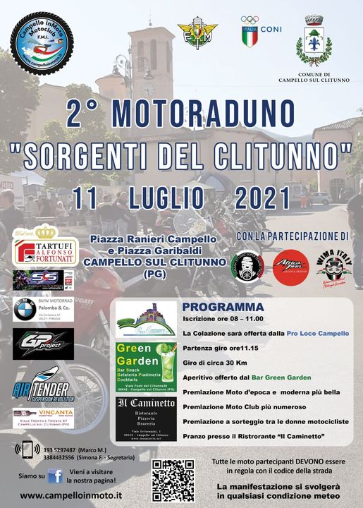Si terrà il prossimo 11 luglio, organizzato MotoClub Campello in Moto, il 2° Motoraduno “Sorgenti del Clitunno”. Sarà un modo di ritrovarsi, a distanza di un anno, per gli appassionati motociclisti; un’occasione per tornare a respirare aria di normalità dopo mesi in cui i mezzi sono stati costretti in garage, e non solo per il freddo.