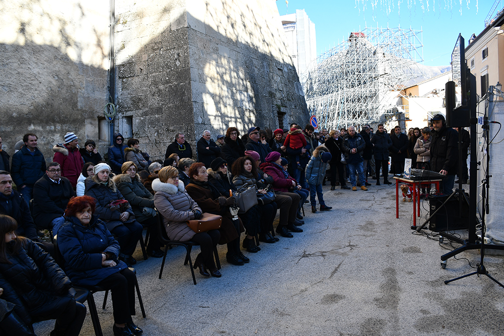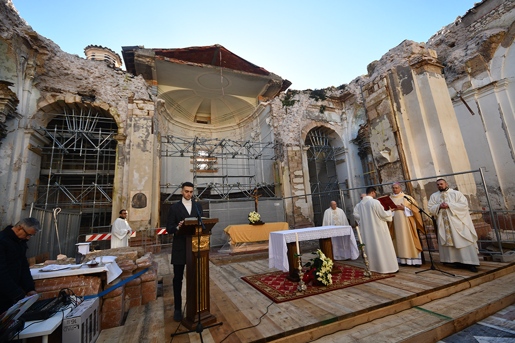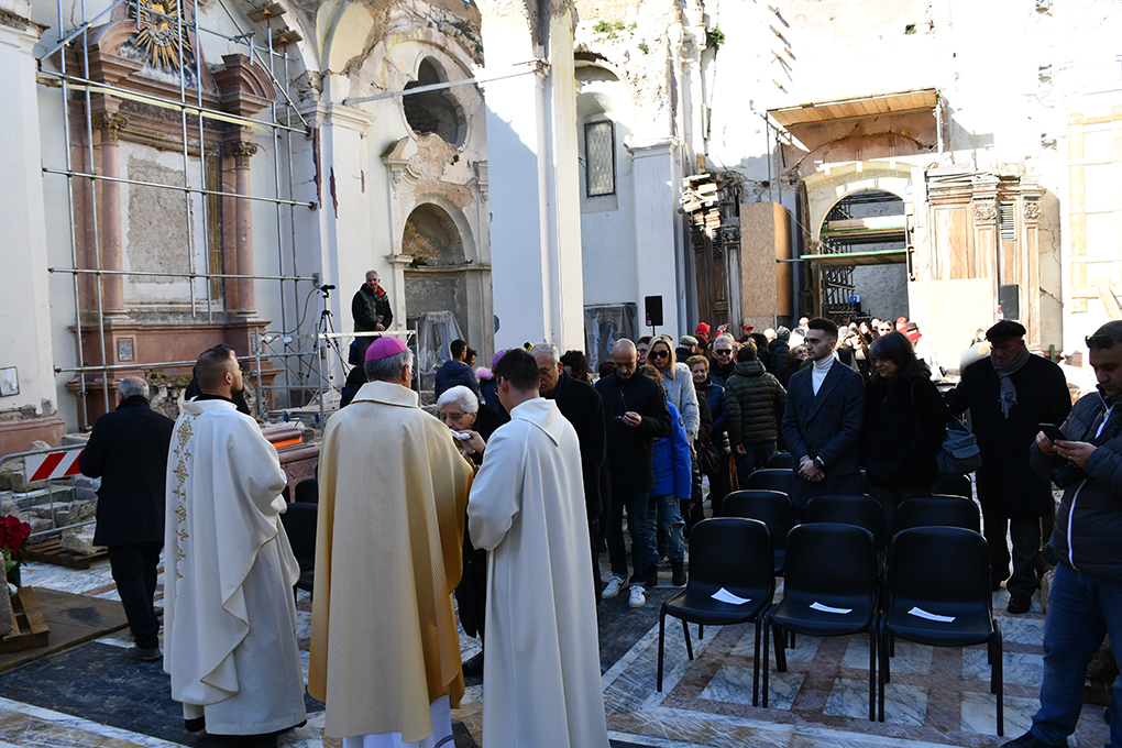 E naturalmente ha fornito le spiegazioni. «Può essere innanzitutto – ha detto – un esercizio dolce e nostalgico della memoria, che ci riconduce ai Natali prima del terremoto, quando qui si veniva in famiglia a celebrare la nascita del Salvatore. E mentre li accarezziamo con lo sguardo, il volto sfigurato di Santa Maria Argentea e queste pietre accatastate parlano al cuore… Può essere un gesto di solidarietà verso i tanti terremotati. Anche la comunità cristiana ha perduto la sua casa. Qui essa si edificava come popolo di Dio per mezzo dell’ascolto della Parola, la celebrazione dei sacramenti e la testimonianza della carità. E anche Dio ha dovuto lasciare questa casa, privata ormai di luci e di suoni, divenuta muta riproposizione della sorte a Lui toccata il giorno stesso della sua nascita: «non c’era posto per loro nell’alloggio», dice il Vangelo (cf Lc 2, 7). La sobrietà del luogo che ci accoglie, preparato per l’occasione senza sottrarre fondi e mezzi destinati ad altre finalità, richiama in maniera eloquente la povertà e la semplicità della grotta di Betlemme. Questa celebrazione – ha detto il Presule – può essere ancora un grido di dolore e di speranza: dolore per il prolungarsi dell’attesa che affievolisce fino a spegnerli sogni e progetti; speranza che, nonostante tutto, mantiene viva la fiducia nell’uomo e nella sua capacità di lavorare efficacemente per l’edificazione del bene comune, al di fuori e al di sopra di interessi e fazioni. Può essere infine una implorazione accorata che sale a Dio affinché continui a prendersi cura provvidente dei suoi figli, e si rivolge alle Istituzioni perché il grande cantiere della ricostruzione imbocchi finalmente il cammino della concretezza. E allora a Gesù che viene tra noi chiediamo il dono di un’esistenza rinnovata, di una politica con più fiato, di una maggiore attenzione a chi ci sta accanto, di una più grande fiducia nelle istituzioni, meno egoismi privati e più coraggio pubblico, l’apparire di prospettive capaci di giustificare i sacrifici che dobbiamo affrontare, un tempo – ha concluso il Presule – per tutti di concordia, serenità e pace».