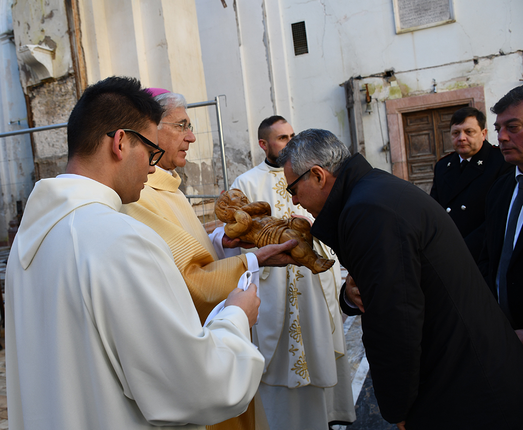 Al termine della Messa mons. Boccardo si è rivolto così ai nursini presenti: «Come avete potuto vedere non è stata una passerella, ma un momento di preghiera intenso. È stato commovente il silenzio che ha caratterizzato questa celebrazione: in alcune parti di essa abbiamo sentito solo il grugare dei colombi. Un ulteriore piccolo segno che fa nascere in tutti noi sentimenti e pensieri di pace e di gioia, indespensabili per ricostruire moralmente e materialmente Norcia, ma anche Cascia, Preci e gli altri centri terremotati». Dopo la benedizione finale, mons. Boccardo ha preso in mano il Bambinello e tutti i presenti si sono avvicinati per baciarlo. Naturalmente, sono entrati in chiesa anche tutti coloro che hanno partecipato alla Messa dall’esterno.