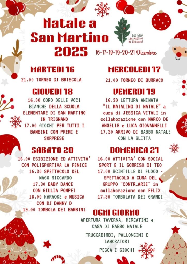 E’ tutto pronto per il “Natale a San Martino 2025 ”. Dopo il successo degli scorsi anni, la Proloco di San Martino in Trignano ha deciso di replicare l’evento. Dopo due giornate dedicate ai giochi della Briscola e del Burraco, per 4 pomeriggi, dal 18 al 21 dicembre, il Verde attrezzato si veste a festa con mercatini, laboratori, suoni e sapori dal gusto natalizio.