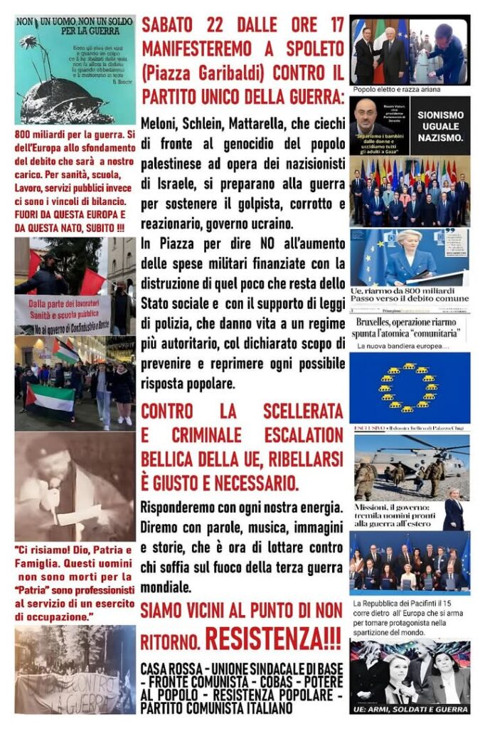 Saranno molte le realtà politiche e sindacali che parteciperanno alla manifestazione del 22 marzo. Con Casa Rossa ci saranno l’ Unione Sindacale di Base, il Partito Comunista Italiano, il Fronte Comunista, Confederazione Cobas, Potere al Popolo, Resistenza popolare, Coordinamento ternano per la Palestina.