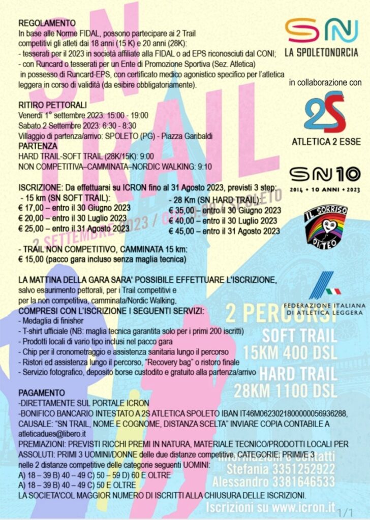 Due i percorsi competitivi tracciati: SN Hard Trail di 28 km e SN Soft Trail di 15 km, entrambi circolari che vedranno la loro partenza ed arrivo a piazza Garibaldi a Spoleto, dopo aver toccato, oltre alla Vecchia Ferrovia, Borgiano, Vallocchia, Val Ceca, Castelmonte, Monteluco.