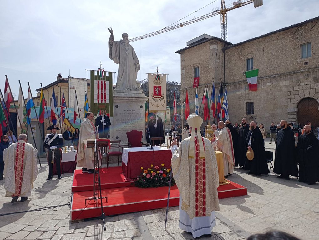 Venerdì 21 marzo 2025 Norcia ha celebrato il suo figlio più illustre, S. Benedetto. In una città cantiere per la ricostruzione post sisma 2016, sotto la grande statua del Santo patrono d’Europa e poco distante dalla Basilica che ne custodisce il luogo natale e che si spera di riaprire entro la fine dell’anno, l’arcivescovo di Spoleto-Norcia mons. Renato Boccardo ha presieduto la solenne concelebrazione eucaristica con la partecipazione delle autorità civili e militari, tra cui la presidente della Giunta regionale dell’Umbria Stefania Proietti, e di tanti fedeli. Hanno concelebrato i sacerdoti della Pievania dei Santi Benedetto e Scolastica, don Marco Rufini e don Davide Tononi, don Davide Travagli della Pievania di Santa Rita a Cascia e don Luciano Avenati parroco emerito dell’Abbazia di S. Eutizio. Prima della celebrazione ha sfilato in Piazza il Corteo Storico della Città di Norcia, in rappresentanza delle sei guaite (attuali rioni cittadini): Porta Meggiana, Porta Massari, Porta Orientale, Porta Palatina, Porta Valledonna e Porta Narenula. Presenti i monaci dell’Abbazia di S. Benedetto in Monte, luogo dove la vigilia della festa, il 20 marzo, è giunta la Fiaccola benedettina “Pro pace et Europa una”, dove il sindaco della Città Giuliano Boccanera ha consegnato il reliquiario del Santo all’abate Benedetto Nivakoff e dove sono stati celebrati i primi vespri in onore del fondatore del monachesimo occidentale. La cerimonia è poi proseguita nella piazza centrale di Norcia con l’arrivo della Fiaccola e l’accensione del tripode dinanzi la statua di S. Benedetto. Gesti simbolici, ma, come è stato sottolineato negli interventi, con un forte richiamo alla costruzione della pace partendo dagli ambienti della vita quotidiana di ciascuno.