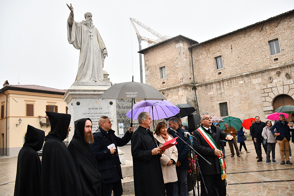 Alle 7.41 di mercoledì 30 ottobre 2019 gli abitanti di Norcia, l’arcivescovo di Spoleto-Norcia e presidente della Conferenza episcopale umbra mons. Renato Boccardo, il sindaco Nicola Alemanno, la neo presidente della Regione Umbria Donatella Tesei, la sovrintendente all’Archeologia, alle Belle Arti e al Paesaggio dell’Umbria Marica Mercalli, i parroci della città don Marco Rufini e don Davide Tononi, i Monaci benedettini col priore padre Benedetto Nivakoff, le autorità civili e militari si sono ritrovati intorno alla statua di S. Benedetto, nella centralissima piazza nursina, per partecipare al momento di preghiera in occasione del terzo anniversario degli eventi sismici del 26 e 30 ottobre 2016 che hanno ferito la Valnerina. Tutti insieme hanno chiesto a Dio Creatore e Padre di soccorrere questa gente che porta “le ferite dei cataclismi che scuotono la profondità della terra e di vegliare sulle famiglie del territorio e sul lavoro”.