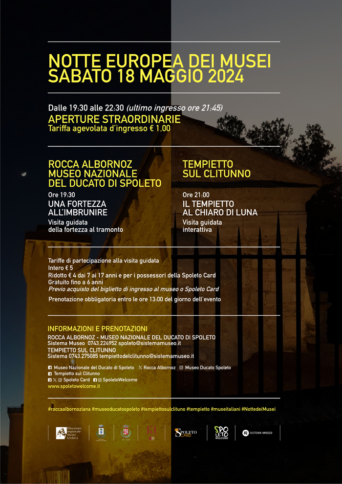 Sabato 18 maggio, in occasione della Notte Europea dei Musei 2024, la Rocca Albornoz di Spoleto e il Tempietto di Campello sul Clitunno rimarranno aperti dalle 19.30 alle 22.30 (ultimo ingresso 21.45) al costo simbolico di € 1,00.
