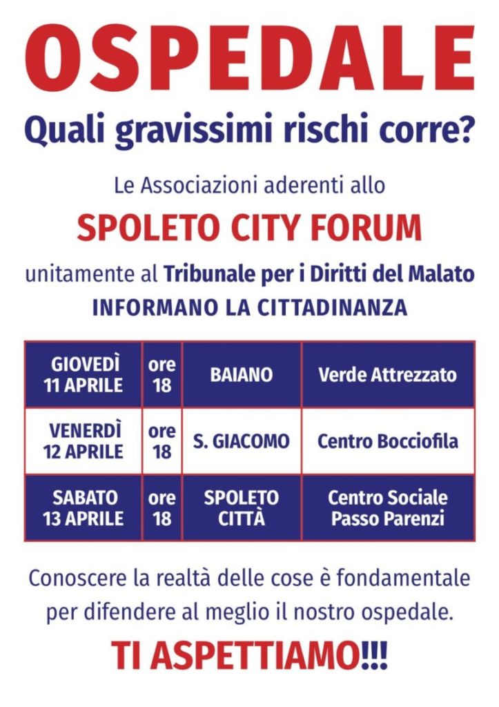 Lo Spoleto City Forum, 46 Associazioni aderenti del territorio, ha organizzato mirati incontri con la cittadinanza, al fine di informare gli spoletini sui rischi reali che sta correndo il nostro Ospedale.