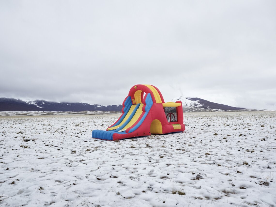 Nello specifico i progetti “Brenva” e “Aquila”, che verranno acquisiti da Palazzo Collicola, nascono dalla ricerca di Stefano Cerio attraverso la creazione di installazioni ambientali. In “Aquila” (2019-2021), l’artista ha installato chiese, castelli e scivoli gonfiabili nel paesaggio circostante la città abruzzese colpita dal terremoto del 2009, luoghi frequentati da escursionisti ripresi nel momento di vuoto e silenzio e riattivati dalla presenza di giochi da luna park.