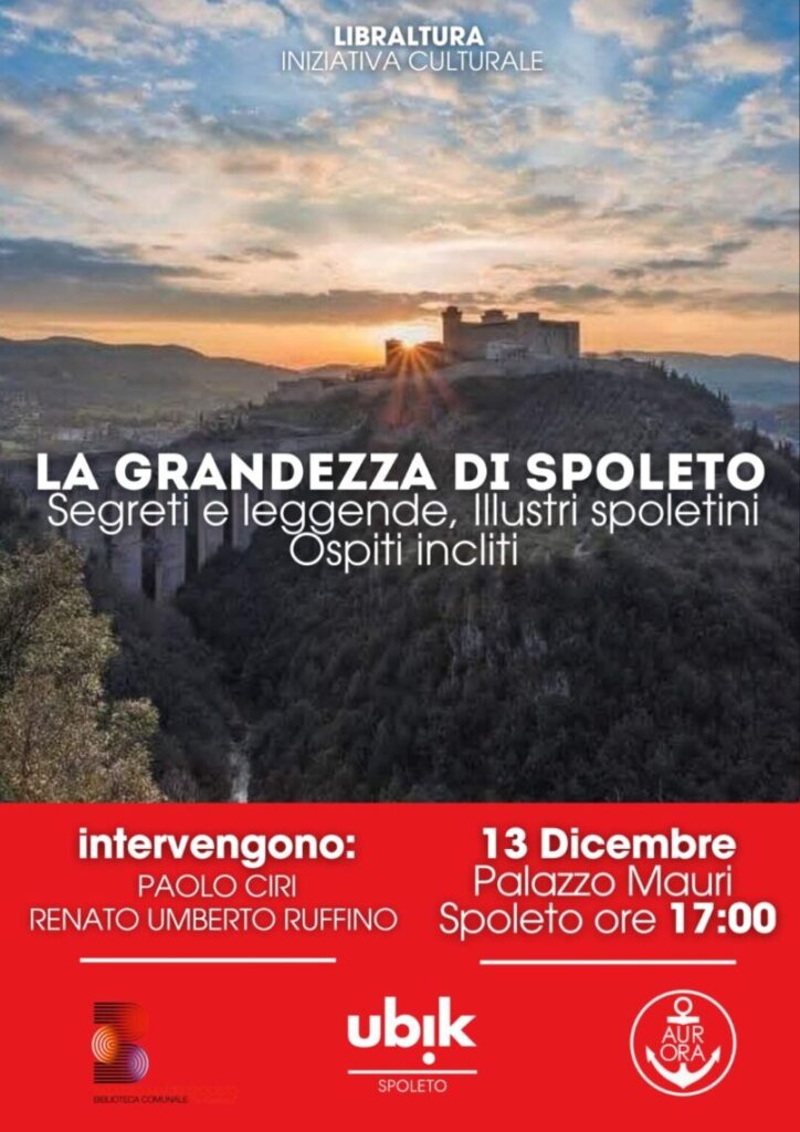 Sabato 13 dicembre, a Palazzo Mauri, sede della Biblioteca Comunale Giosuè Carducci, lo spoletino Paolo Ciri presenterà il suo nuovo libro: “Spoleto S.I.O.”. L’acronimo sintetizza le tre parti della sua ricerca: – Storie e leggende – Illustri Spoletini – Ospiti ìncliti Si tratta di una sintetica e snella trattazione di storie e leggende che riguardano la città, la vita di alcuni cittadini, nativi o acquisiti, che si sono resi famosi o insigni, le visite di Papi, Imperatori, scienziati, artisti, letterati, religiosi, studiosi, a Spoleto. Il libro è nato per la collana della Uni.Tre. (Università delle Tre Età), che però è fuori commercio. Per cui ne viene pubblicata anche un’altra versione, acquistabile. L’incontro sarà tenuto dal Presidente della Uni.Tre., Antonio Laureti, dal Vicepresidente, Adolfo Nobili, e da Renato Umberto Ruffino di Libraltura Associazione di cui fanno parte anche le librerie di Spoleto, organizzatrice dell’incontro. Appuntamento sabato 13 dicembre alle ore 17,00 a Palazzo Mauri.