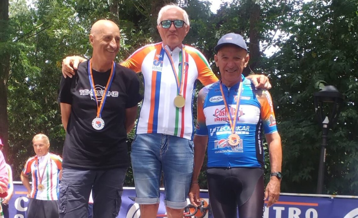 In Basilicata Orazi ha bissato il bronzo ottenuto lo scorso maggio ai tricolori di Mediofondo di Pretoro, stavolta su un terreno sulla carta non dei più adatti alle proprie caratteristiche. Il veterano del Bici Club, capace di dare il meglio di sé tradizionalmente sulle lunghe distanze, si è infatti ben disimpegnato anche in una prova secca di 9,9 km, tutti a salire, con punte di pendenza anche in doppia cifra, fino al centro abitato di Ruoti. Forte della sua esperienza l’atleta di San Giacomo ha quindi impostato una scalata regolare, che gli ha permesso di chiudere sul 3° gradino del podio tra i corridori di categoria in lotta per la maglia tricolore del CSI. Oltre alla conferma di Orazi la trasferta potentina ha fatto registrare anche il gradito ritorno in gara di Mario Bea (M7), che è tornato a indossare un dorsale dopo un periodo di lontananza dalle competizioni ufficiali, dovuto in primis agli infortuni, che durava dal lontano 2012. Nonostante un po’ di fisiologica ruggine, specie per un esercizio così specifico come quello della cronoscalata, il trevano ha rotto il ghiaccio con una prestazione di buona caratura tecnica, concludendo in 4° posizione a poco più di 30’’ dalla medaglia di bronzo. Un’ultima grande soddisfazione è arrivata infine dall’Abruzzo, dove Emanuele Mancini (Junior Master), si è imposto nel 2° Trofeo Dino e Luca, prova di 60 km in circuito dipanata lungo le strade di Cerratina.