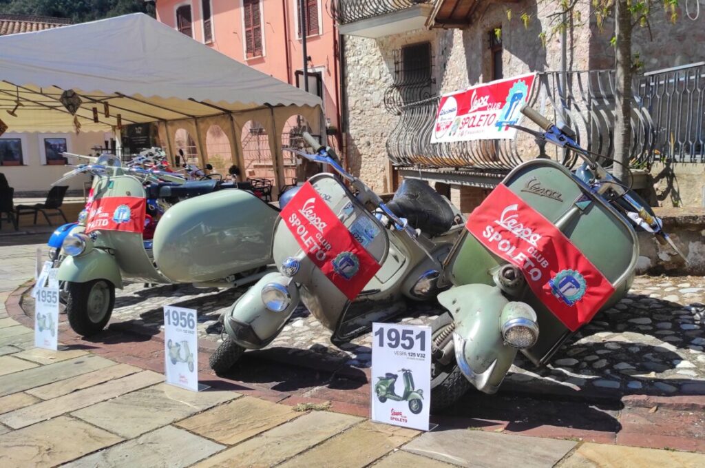 Sabato 5 aprile, nella suggestiva piazza di Scheggino, adiacente al Museo del Tartufo Urbani, il club ha avuto l’opportunità di esporre una selezione di modelli storici della Piaggio, che hanno segnato la storia del marchio dal 1950 agli anni ’80, regalando un viaggio nel tempo agli appassionati e ai visitatori.