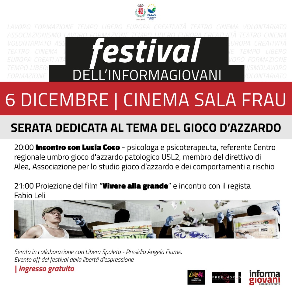 Come nelle precedenti tappe del tour, il regista Fabio Leli sarà presente alla proiezione per rispondere alle domande sul film e alle curiosità del pubblico su un tema, come quello del gioco d’azzardo legalizzato, che sta modificando le abitudini e il modo di vivere di tanti cittadini italiani. La proiezione sarà preceduta, alle ore 20:00, da un incontro con Lucia Coco, psicologa, psicoterapeuta e referente del Centro Regionale Umbro Gioco D’azzardo Patologico.