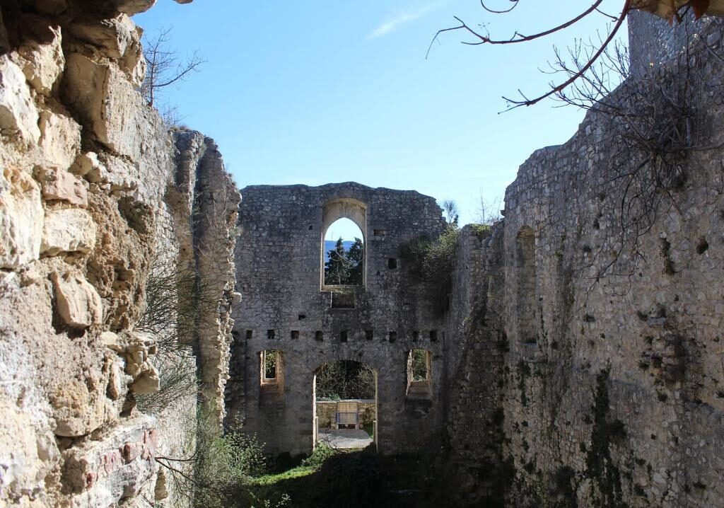 Il nome del paesello significa “ai piedi del bosco sacro”, ma non per questo tutto ciò che merita la nostra attenzione si trova alla nostra altezza. Ho voltato le spalle alla distesa azzurra e alzato lo sguardo verso la vegetazione che mi era dietro, e notato qualcosa di particolarmente misterioso. Cielo azzurro e innumerevoli arbusti. E poi una strana struttura in pietra, di cui subito saltano agli occhi i due archi e la torre affiancata. In linea d’aria era a dir poco sopra di me, eppure le uniche parole che sembravano venirmi in mente erano solitudine, lontananza, austerità.