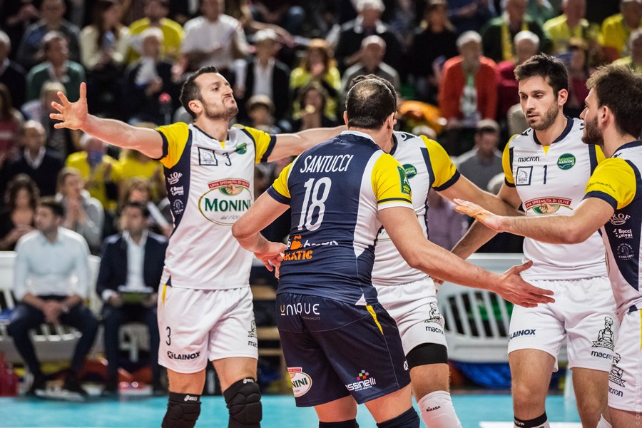 Per il terzo anno consecutivo la Monini Marconi è nella semifinale dei playoff promozione. E per fortuna che qualcuno aveva già indicato questa squadra come “bollita”. Gli oleari, nel frastuono del Palarota, replicano la prestazione maiuscola di Gara 1 e staccano il pass per la sfida, sempre al meglio delle tre gare, contro la Gas Sales Piacenza, vittoriosa col massimo scarto su Brescia. Dopo un primo set “spaccato” dai servizi di Padura Diaz, nel secondo succede di tutto dal 24 pari in poi, e solo una squadra dal cuore enorme come questa Monini Marconi avrebbe potuto farlo suo. Il coronamento di una serata indimenticabile arriva con la super rimonta del terzo parziale, da 6-12 a 25-19 in un Palasport strabordante di entusiasmo. Nella serata in cui Padura Diaz non brilla, ma è comunque decisivo, splende la stella di Romolo Mariano, autentico trascinatore dei suoi, ma non è da meno quella di Francesco Zoppellari, votato all’unanimità MVP.