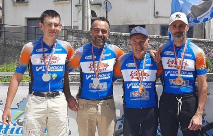 Sventola alta la bandiera del Bici Club Spoleto “Castellani Impianti” ai Campionati Italiani di Mediofondo del CSI, in scena domenica 25 maggio sulle strade teatine di Pretoro. In Abruzzo la compagine amatoriale spoletina ha dato sfoggio, in quello che era uno degli appuntamenti clou della stagione, di una rimarchevole prestazione collettiva, portando a casa un totale di quattro medaglie, con gli argenti di Emanuele Mancini (Elite Sport) e Ugo Laudati (M6) e i bronzi di Raffaele Cavalli (M4) e Paolo Orazi (M9).