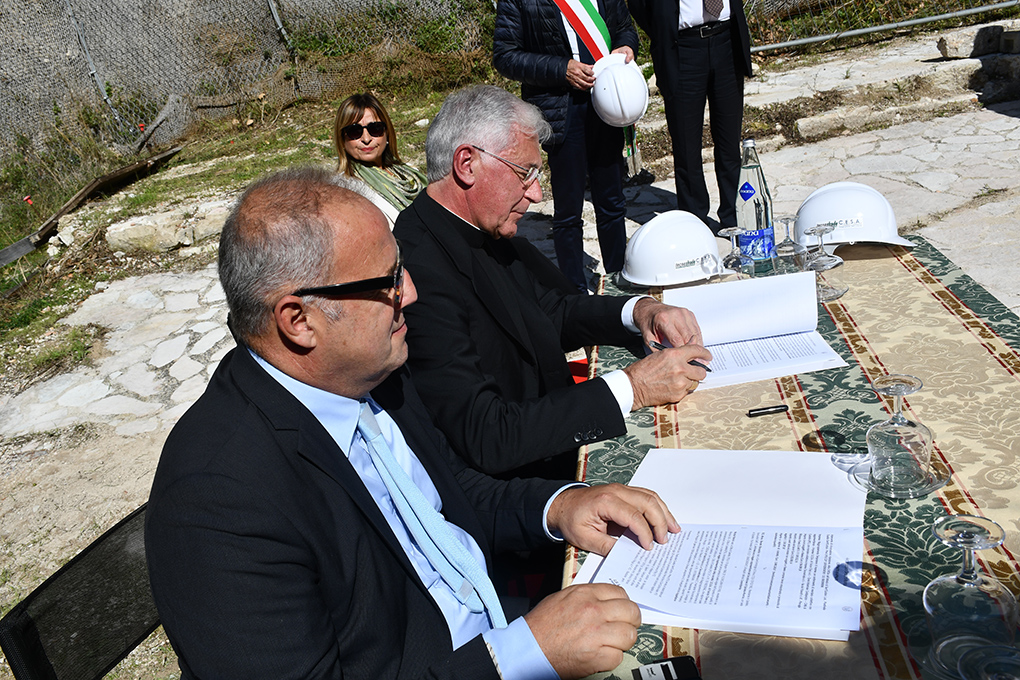 Prima di questo atto formale ci sono stati i saluti istituzionali dell’Arcivescovo, della presidente della Giunta Regionale dell’Umbria Donatella Tesei, del sindaco di Preci Massimo Messi, dell’ing. Fulvio Soccodato sub commissario alla ricostruzione, dell’ing. Stefano Proietti Nodessi direttore dell’ufficio speciale alla ricostruzione dell’Umbria e del dott. Nicola Salini della struttura commissariale. L’on. Giovanni Legnini, commissario straordinario alla ricostruzione, non ha potuto partecipare all’evento in quanto ha contratto il Covid-19. C’era il parroco don Luciano Avenati e il vicario generale della Diocesi don Sem Fioretti. È stata anche portata la pietra dell’Abbazia benedetta da Papa Francesco lo scorso 17 settembre, simbolo della ricostruzione dell’intero complesso. Erano presenti anche autorità civili e militari del luogo, oltre a diversi fedeli della zona. L’importo complessivo dei lavori per il recupero della chiesa abbaziale è di 3.960.245,61 euro. Entro il mese di ottobre ci sarà l’altro atto formale dopo la firma del contratto che è la consegna del cantiere, cui seguirà immediatamente l’avvio dei lavori.