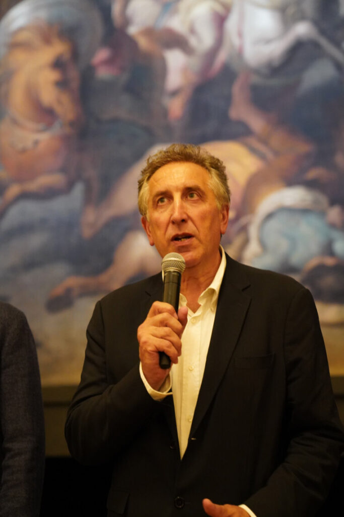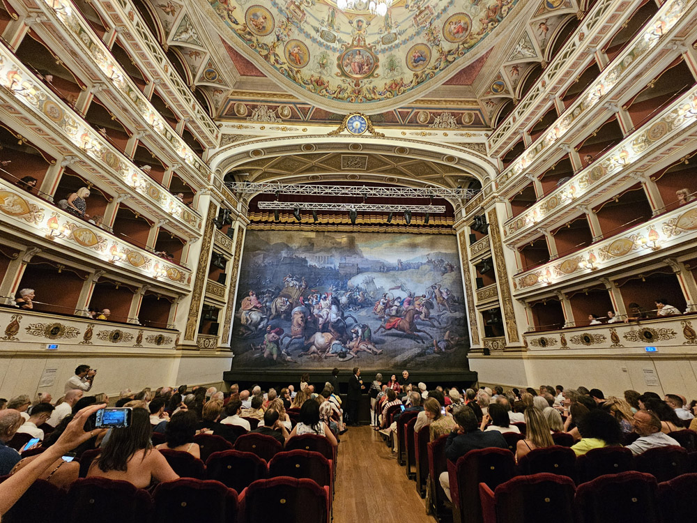 “Il Teatro Nuovo ha subito nel tempo sostanziali trasformazioni. Per esempio laddove oggi ci sono i camerini e gli uffici all’inizio era collocato un ristorante e le camere per gli artisti e la stessa fossa dell’orchestra non compariva nel progetto di Aleandri: i musici occupavano parte della platea – ha argomentato l’architetto Moreno Orazi dello Studio Abaco – Se dunque il Teatro ha subito dalla sua costruzione ad oggi notevoli trasformazioni tuttavia forte negli anni è stata l’azione di tutela tesa a conservare alcune peculiarità della sua architettura. Tra queste senza dubbio il restauro del Sipario Storico, grazie all’intervento splendidamente eseguito dalla società COOBEC, che torna finalmente da oggi a svolgere la funzione di meraviglioso fondale scenico della platea, visibile prima dell’inizio e durante gli intervalli di uno spettacolo. Un grazie particolare a quanti hanno reso possibile il rimontaggio del Sipario Storico in Teatro, operazione tecnica per niente semplice”.