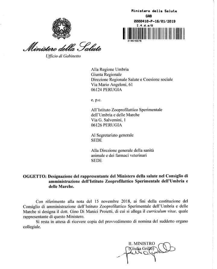 Sarà rappresentante del Ministero della Salute nel Consiglio di Amministrazione dell’Istituto Zooprofilattico Sperimentale dell’Umbria e delle Marche