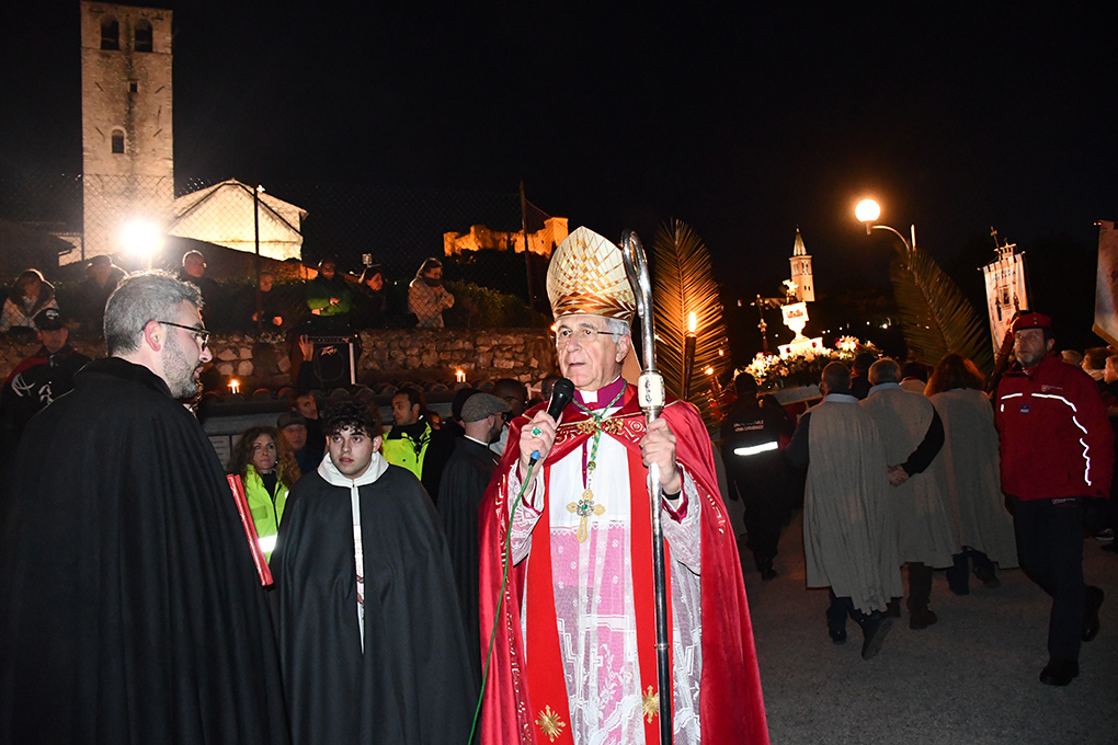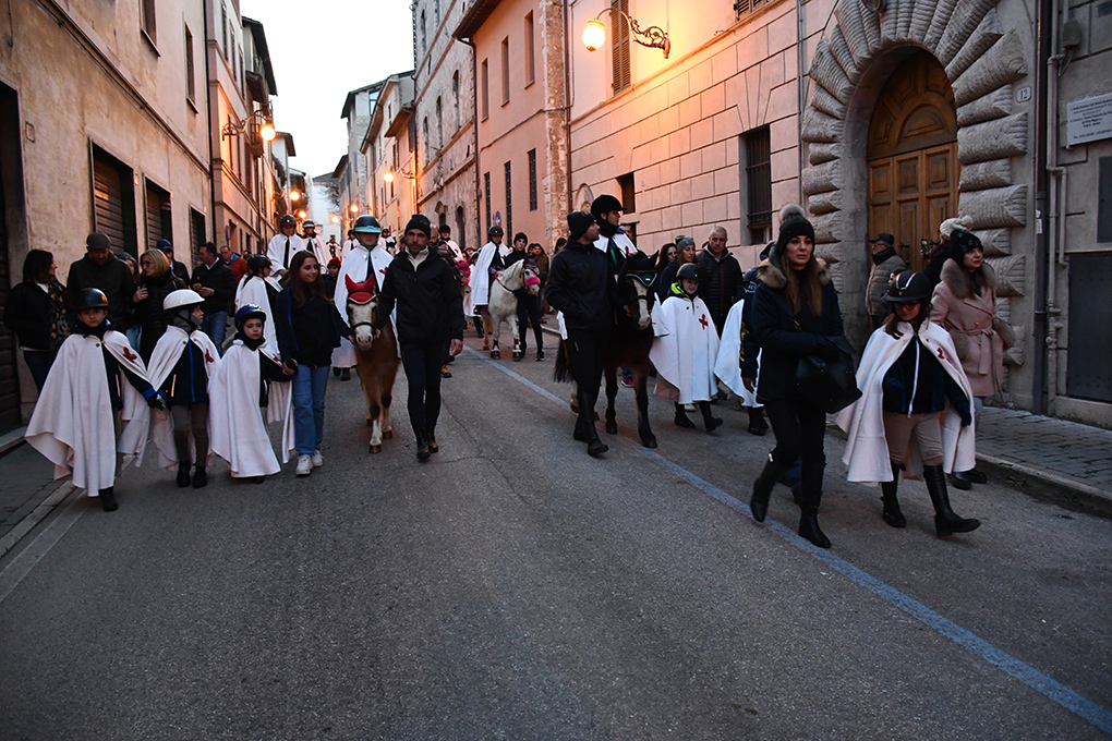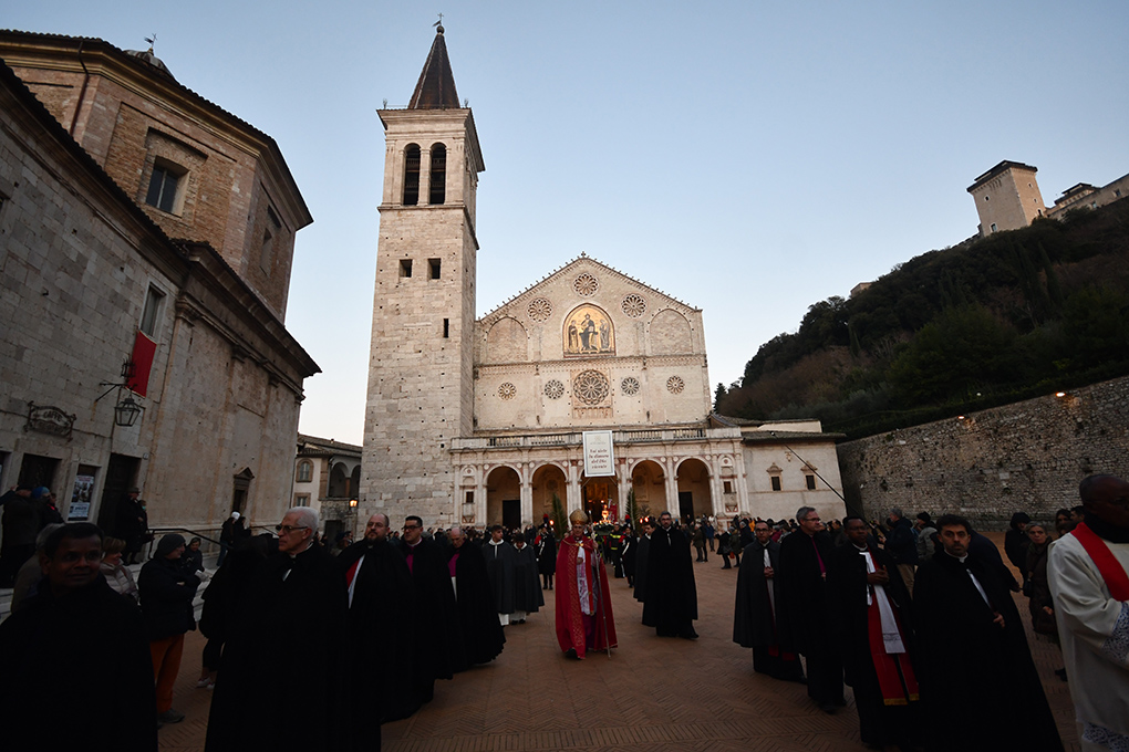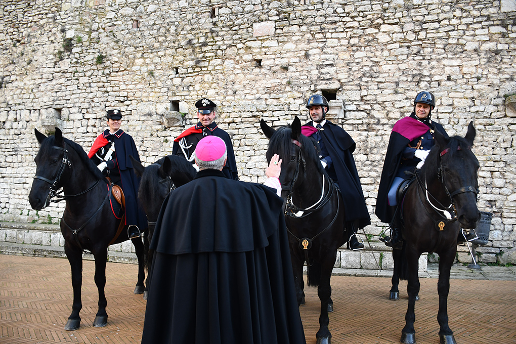 Nel pomeriggio di sabato 14 gennaio 2023 l’arcivescovo di Spoleto-Norcia mons. Renato Boccardo ha presieduto nella Basilica Cattedrale i Secondi Vespri pontificali di S. Ponziano, patrono della Città e dell’intera Archidiocesi. Ancora una volta, come già al mattino per la Messa solenne, il Duomo era pieno di fedeli. Al termine, si è snodata per le vie della Città la processione per riportare la reliquia di S. Ponziano, il cranio, nella basilica a lui dedicata. Questo evento della pietà popolare, molto sentito e partecipato, è tornato dopo due anni di stop a causa della pandemia. La processione, come da tradizione, è stata aperta da oltre settanta cavalli e cavalieri, aderenti alle scuole equestri del territorio e privati cittadini. A cavallo c’erano anche due agenti della Polizia di Stato, due Carabinieri e due agenti della Polizia Locale. Presente il Gonfalone della Città e il vice sindaco Stefano Lisci in fascia tricolore. Nutrita anche la rappresentanza dei Granatieri di Sardegna della caserma Garibaldi di Spoleto, così i membri di varie associazioni di volontariato del territorio. Giunti dinanzi alla Basilica di S. Ponziano, l’Arcivescovo ha benedetto tutti quanti hanno partecipato alla processione e, a braccio, ha detto: «Siamo tutti radunati nel nome e nella memoria del nostro Santo. Ringrazio tutti voi cittadini di Spoleto per questa bella testimonianza di unità, di amicizia e di condivisione. Ringrazio tutte le associazioni di volontariato che in modi diversi hanno contribuito alla buona riuscita di questo momento così significativo e così caro alla nostra coscienza di spoletini. Ringrazio tutti i cavallari che hanno preceduto la processione. Siamo qui come un’unica famiglia che guarda a chi ci ha preceduto e che sente la necessità e il dovere di custodire e di conservare dei legami di amicizia, di fraternità e di solidarietà. Qualcuno vorrebbe che il Vescovo – ha sottolineato lo stesso Presule – parlasse a favore degli uni e contro gli altri. Ma il Vescovo è padre e pastore di tutti. E l’unica cosa che può fare, e la fa con seria intenzione, è quella di invitare tutti coloro che dalla fiducia dei cittadini sono stati chiamati a governare la Città, la Regione e il Paese ad assumere un senso di responsabilità per la ricerca e la realizzazione del bene di tutti. Questo significa certamente che ognuno deve lasciare da parte qualche cosa di suo e andare incontro a qualcosa di chi gli sta vicino. Soltanto nella collaborazione e nella comprensione reciproca, solo con un supplemento di generosità si riesce a costruire qualche cosa di bello e di buono che serva a noi e a coloro che vengono dopo di noi. Raccolgo dalla testimonianza di S. Ponziano questo invito che rivolgo a tutti e a ciascuno, senza differenze. Dobbiamo lavorare insieme, superare le contrapposizioni, cercare quello che è il bene di tutti, che non necessariamente corrisponde al mio. Ma se non abbiamo un ideale più alto, se non impariamo ad avere orizzonti più ampi rischiamo di rinchiuderci sempre di più nel nostro piccolo mondo dove si muore per mancanza di ossigeno. Chiediamo a S. Ponziano che ci insegni questo supplemento di generosità, di sensibilità, di attenzione: chiediamogli di aiutarci a fare un’alleanza tra noi in vista di qualche cosa di più bello e grande che possa essere al servizio di tutti, specialmente di coloro che devono affrontare con maggiore difficoltà il peso della vita quotidiana. È soltanto dandoci la mano, riconoscendoci non concorrenti ma fratelli e amici che riusciamo a lasciare qualche cosa dietro di noi. Le nuove generazioni attendo da noi adulti esempi luminosi di vita, parole di verità, gesti di solidarietà e riconciliazione. Questo è il patrimonio che S. Ponziano ci affida». Il pomeriggio si è concluso con la Messa nella Basilica di S. Ponziano presieduta da don Edoardo Rossi parroco di S. Venanzo, Morgnano e Maiano e direttore della Caritas diocesana.