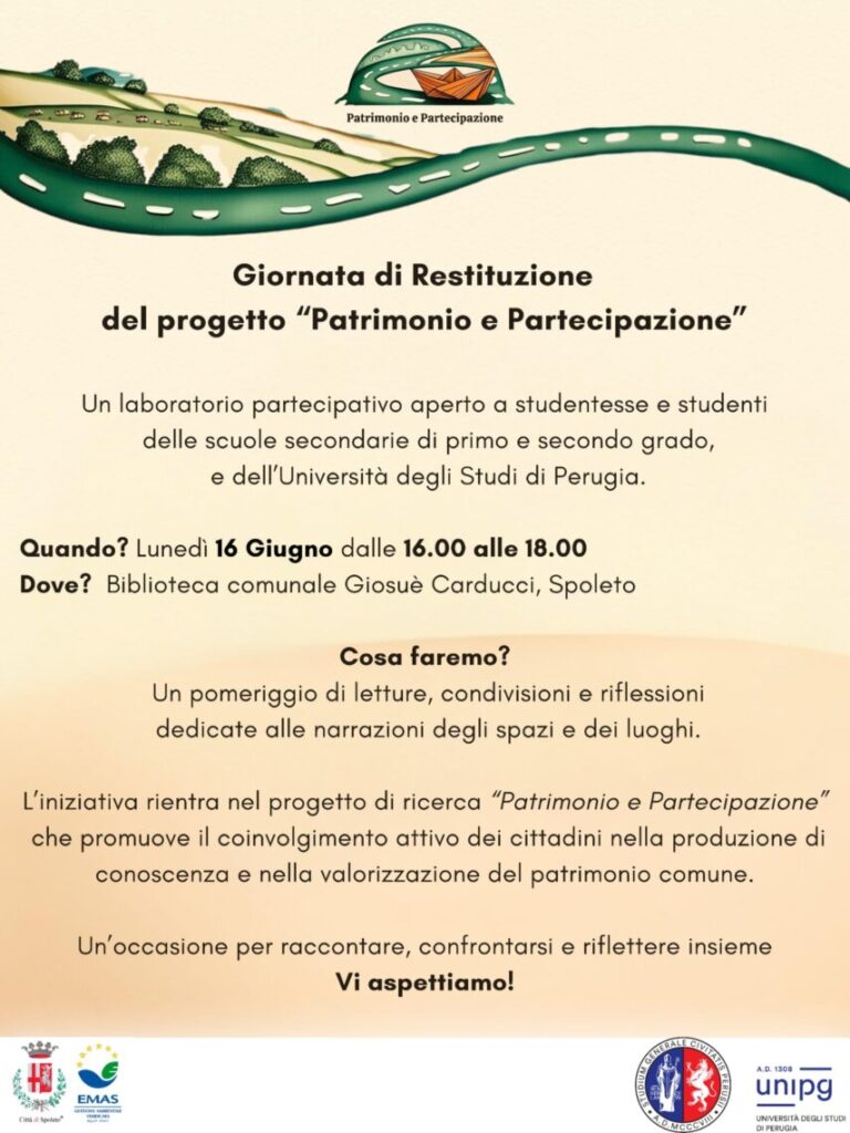 Lunedì 16 giugno, dalle ore 16.00 alle 18.00 nella Biblioteca comunale “G. Carducci” a palazzo Mauri, si terrà la Giornata di Restituzione del progetto “Patrimonio e Partecipazione”, un vero e proprio laboratorio partecipativo aperto a studentesse e studenti delle scuole secondarie di primo e secondo grado e dell’Università degli Studi di Perugia.